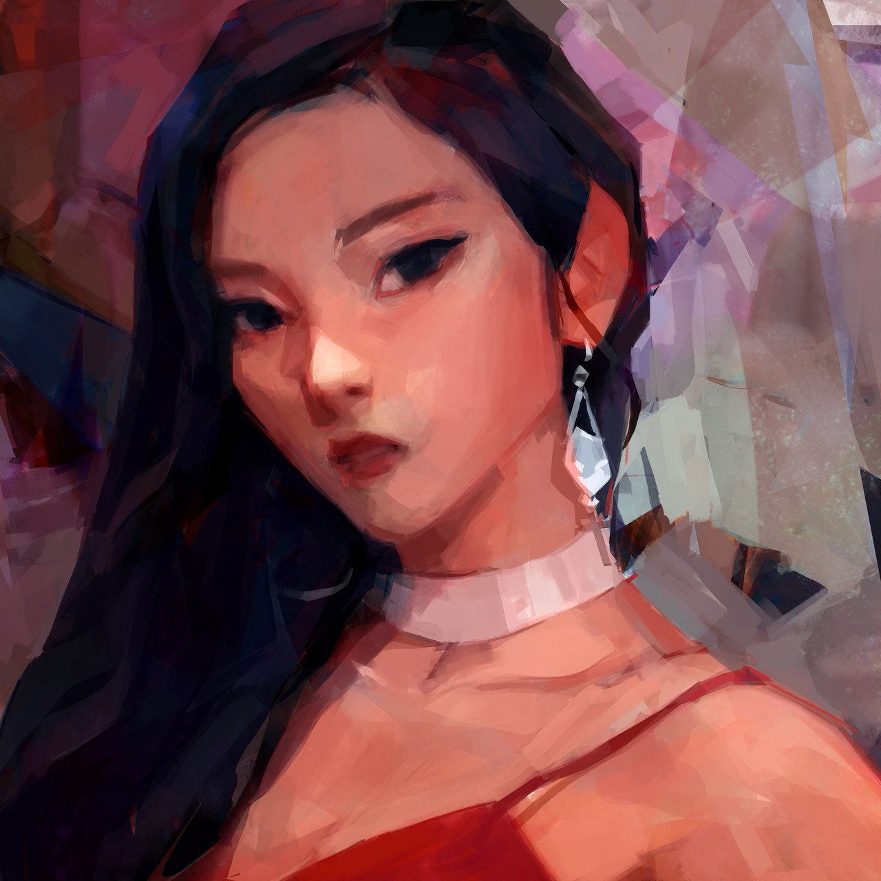 1girl black_eyes black_hair camisole choker closed_mouth commentary earrings english_commentary highres jewelry joy_(red_velvet) k-pop long_hair real_life red_camisole red_lips red_velvet_(group) samuelyounart single_bare_shoulder solo upper_body white_choker