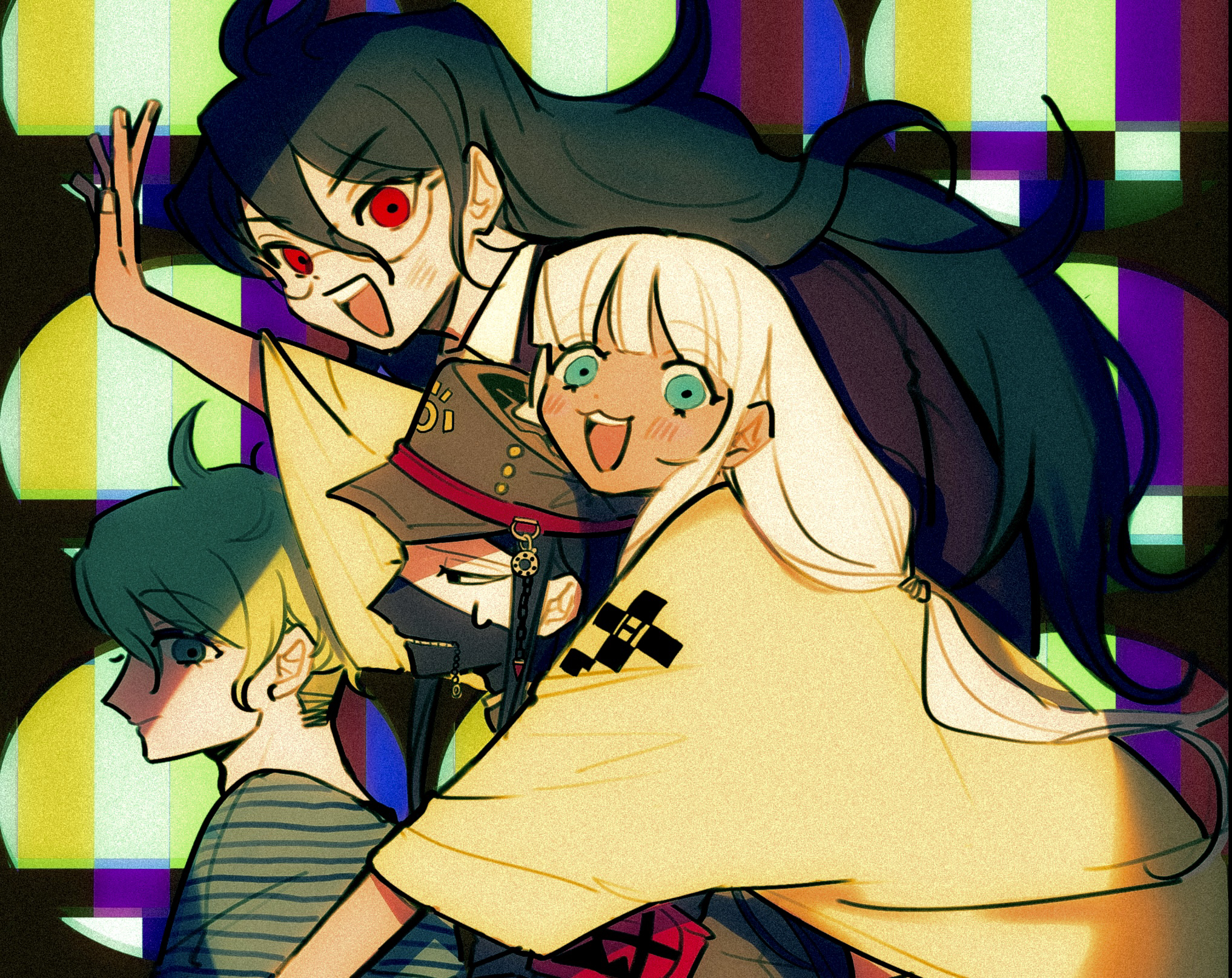 1girl 3boys amami_rantaro antenna_hair armband black-framed_eyewear black_hair black_mask blazer blue_eyes blue_shirt blunt_bangs brown_eyes brown_jacket carrying closed_mouth collared_shirt commentary covered_mouth cowboy_shot danganronpa_(series) danganronpa_v3:_killing_harmony dark-skinned_female dark_skin english_commentary from_side glasses gokuhara_gonta green_eyes green_hair green_hat green_jacket hair_between_eyes hat highres jacket light_blush light_smile long_hair long_sleeves looking_at_viewer low_twintails mask morning_(d0nteat) mouth_mask multiple_boys open_mouth peaked_cap piggyback raincoat red_armband red_eyes round_eyewear shinguji_korekiyo shirt smile striped_clothes striped_shirt sweatdrop teeth television three-quarter_sleeves twintails upper_body upper_teeth_only very_long_hair white_hair white_shirt wide_sleeves yellow_raincoat yonaga_angie zipper