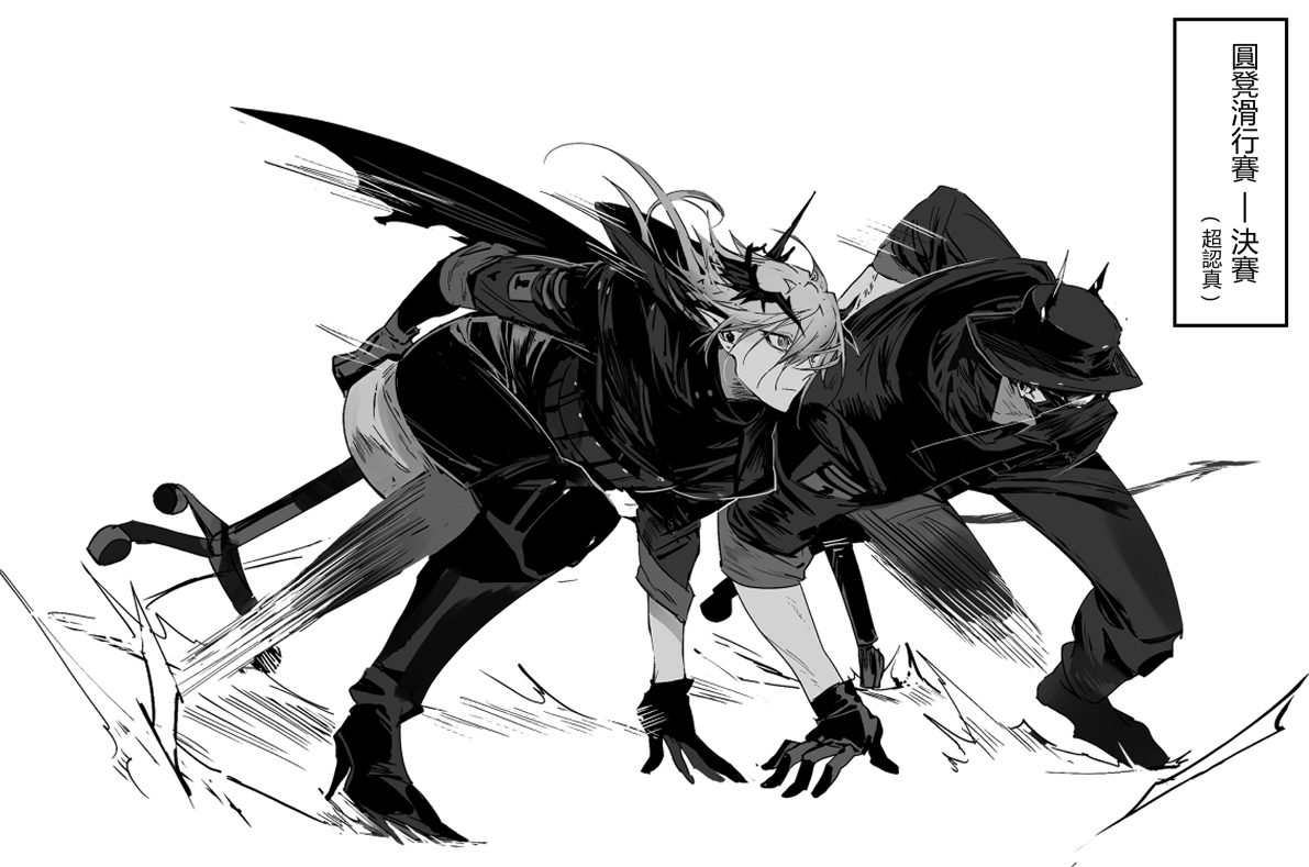 2boys arknights chair comically_serious demon_tail gloves greyscale hat horns horns_through_headwear kaifei_(kaifei_29) leaning_forward logos_(arknights) long_hair monochrome multiple_boys on_stool racing scout_(arknights) serious sleeves_rolled_up stool swivel_chair tail