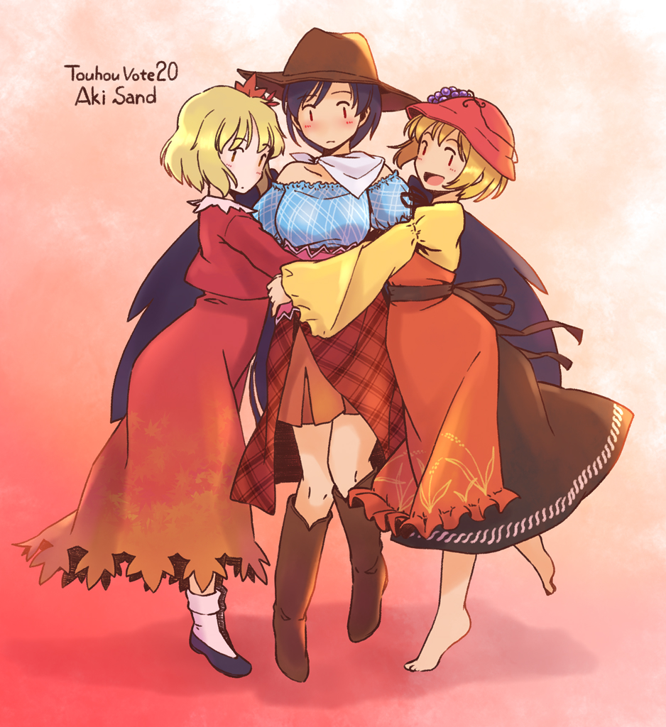 3girls aki_minoriko aki_sandwich_(meme) aki_shizuha apron black_hair blonde_hair boots cowboy_hat full_body hat kurokoma_saki looking_at_viewer meme multiple_girls rangycrow red_apron red_background red_hat red_skirt shirt skirt smile touhou yellow_shirt