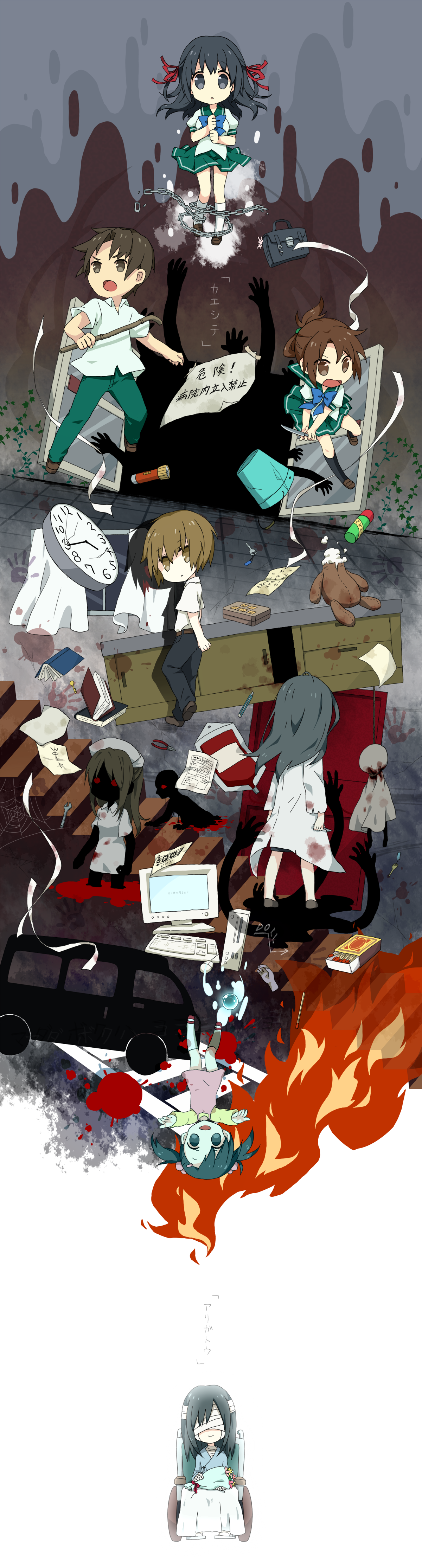 2boys 4girls absurdres agasaki_yuna agasaki_yuna_(real) black_hair blonde_hair blood blood_on_clothes bow brown_eyes brown_hair clock crowbar doctor_agasaki doll_(game) fire fujita_toshiaki highres holding holding_crowbar holding_scalpel kurume_yuki kusunoki_erina lab_coat long_hair mizuki_motoya mother_and_child mother_and_daughter multiple_boys multiple_girls neckerchief nurse parent_and_child ponytail red_bow scalpel school_uniform serafuku shinomaru_hajime short_hair short_ponytail stuffed_toy twintails upside-down wheelchair