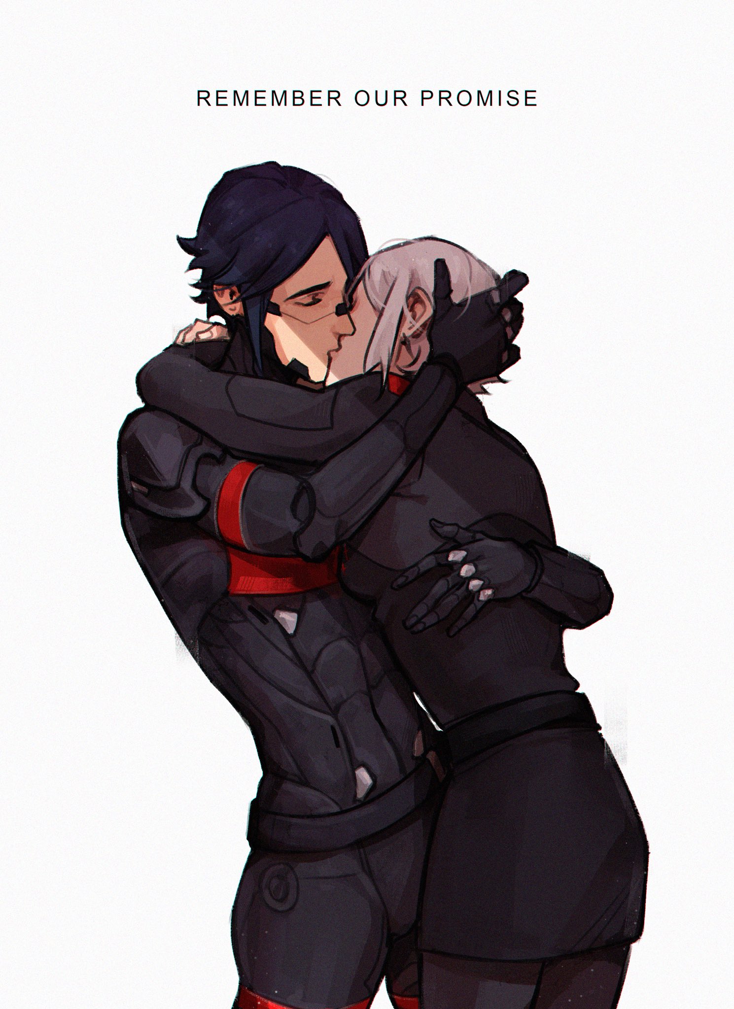2girls android ariane_yeong black_hair black_jacket black_pants black_skirt closed_eyes commentary elster_(signalis) english_commentary english_text highres hug jacket joints kiss linaxchuu military_uniform multiple_girls pants robot_joints short_hair signalis simple_background skirt white_background white_hair yuri