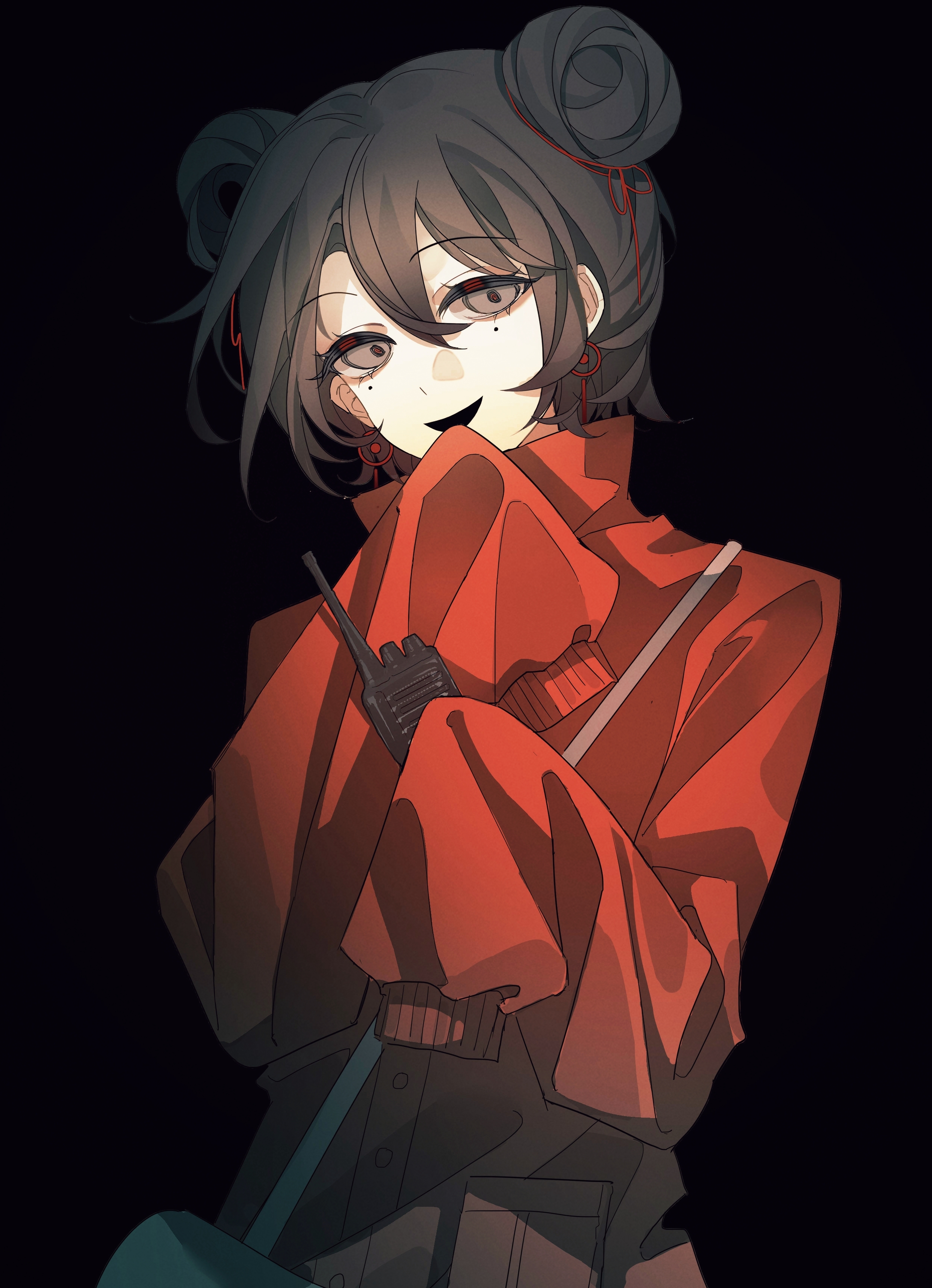 1girl absurdres black_background black_hair chinese_commentary commentary_request earrings grey_eyes hair_between_eyes hair_bun hair_ribbon hair_rings high_collar highres holding holding_walkie-talkie jacket jewelry li_yuting_(female) long_sleeves mole mole_under_each_eye mole_under_eye multiple_moles open_mouth red_jacket red_ribbon ribbon shenhuili short_hair simple_background single_hair_bun single_hair_ring sleeves_past_fingers sleeves_past_wrists smile solo touqi_guaitan upper_body walkie-talkie
