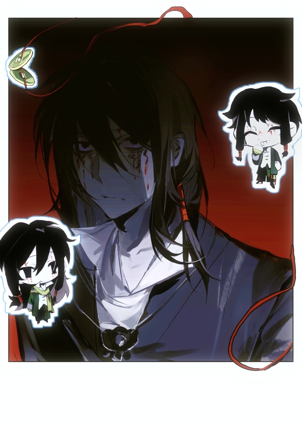 1boy black_eyes black_hair black_jacket black_pants chibi chinese_commentary closed_mouth coin coin_on_string collared_shirt commentary_request facial_tattoo grin hair_between_eyes highres holed_coin jacket liuliang_heidong long_hair male_focus open_clothes open_jacket pants portrait sanpaku scarf shirt smile tattoo touqi_guaitan white_shirt yellow_scarf ziche_fuzhao