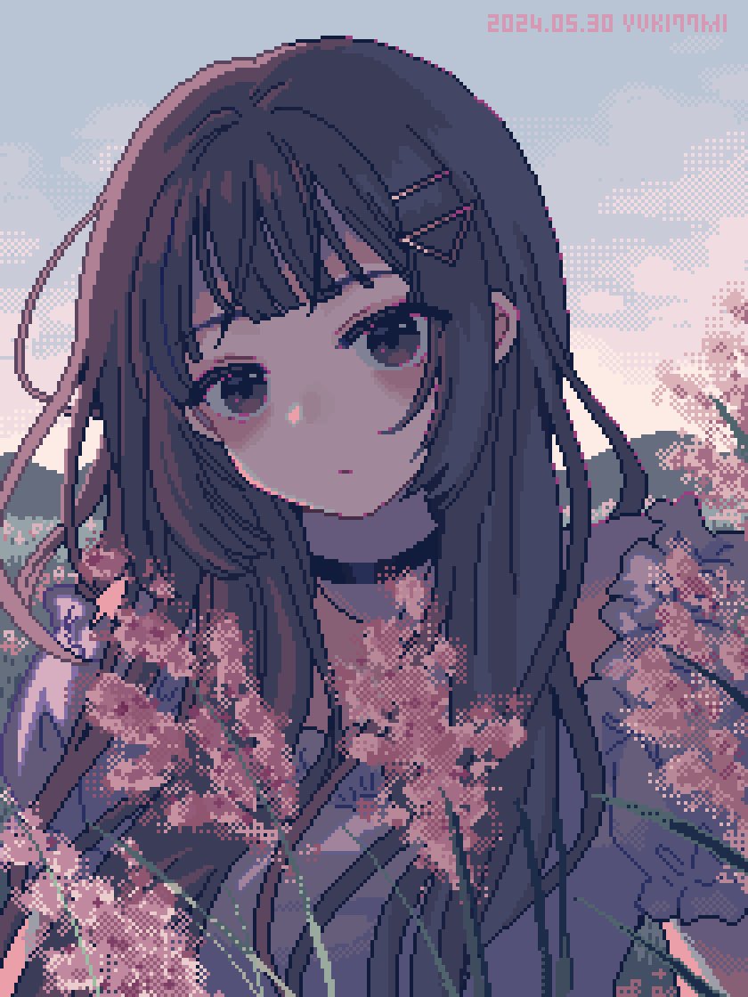1girl :| arms_at_sides artist_name bare_shoulders black_choker blush branch brown_eyes brown_hair cherry_blossoms choker choppy_bangs closed_mouth collarbone dated hair_ornament hairclip hairpin head_tilt long_bangs long_hair looking_at_viewer morning mountainous_horizon nanami_yuki_(yuki77mi) off-shoulder_shirt off_shoulder original outdoors pixel_art shirt sidelocks solo straight-on straight_hair upper_body white_shirt