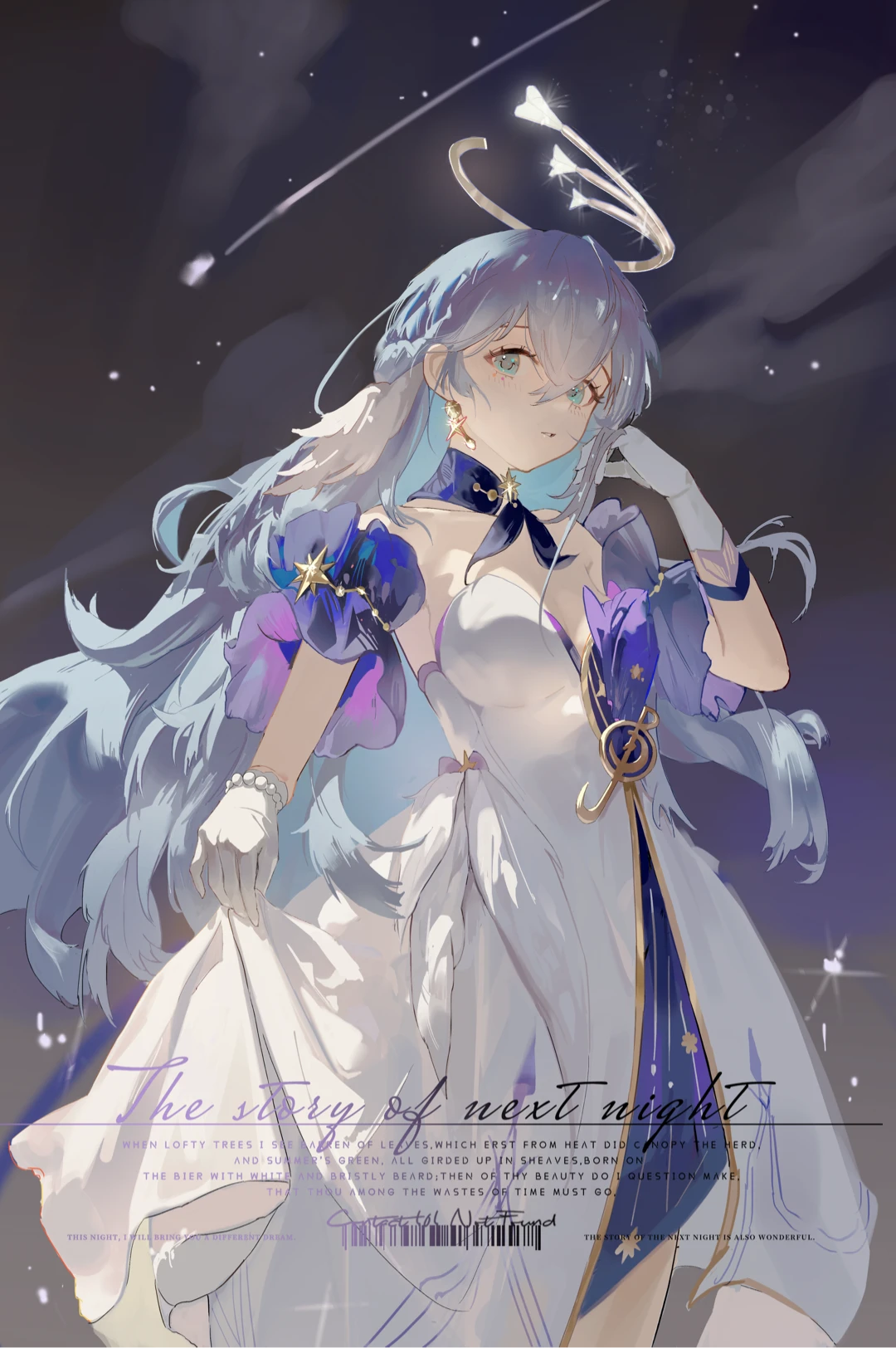 1girl bare_shoulders blue_hair bracelet choker cowboy_shot detached_sleeves dongzhi10223 dress earrings gloves gold_trim green_eyes hair_between_eyes halo hand_up head_wings highres holding_own_dress honkai:_star_rail honkai_(series) jewel_under_eye jewelry long_hair looking_at_viewer musical_note_ornament parted_lips pearl_bracelet purple_choker purple_dress purple_sleeves robin_(honkai:_star_rail) shooting_star short_sleeves sleeveless sleeveless_dress solo strapless strapless_dress two-tone_dress white_dress white_gloves white_wings wings