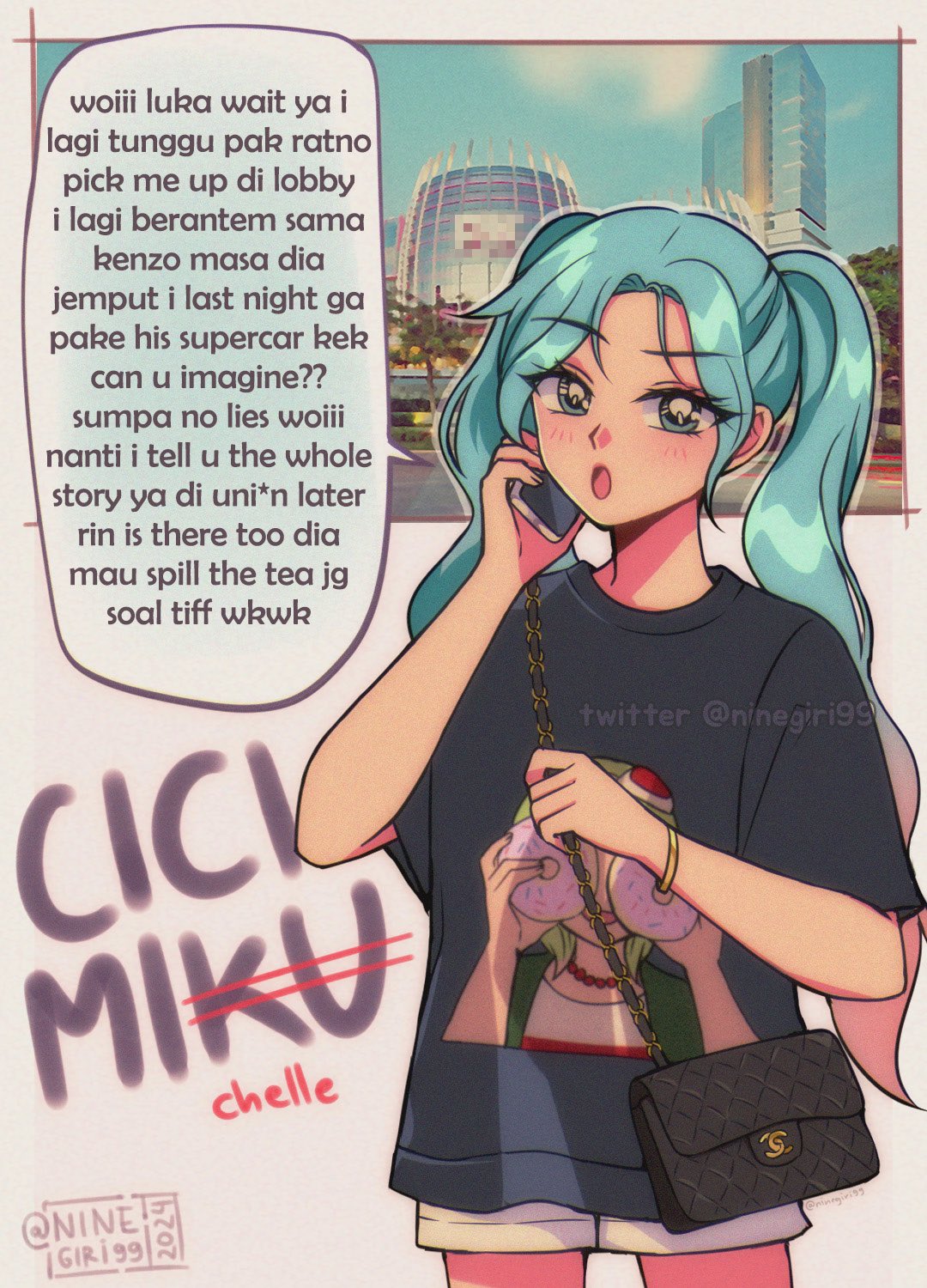 1girl aqua_eyes aqua_hair bag black_shirt cellphone character_name character_print commentary english_commentary english_text engrish_text handbag hatsune_miku highres holding holding_phone indonesia indonesian_text long_hair mixed-language_text ninegiri open_mouth phone print_shirt ranguage shirt short_sleeves shorts smartphone solo speech_bubble t-shirt tongue translation_request vocaloid white_shorts worldwide_miku