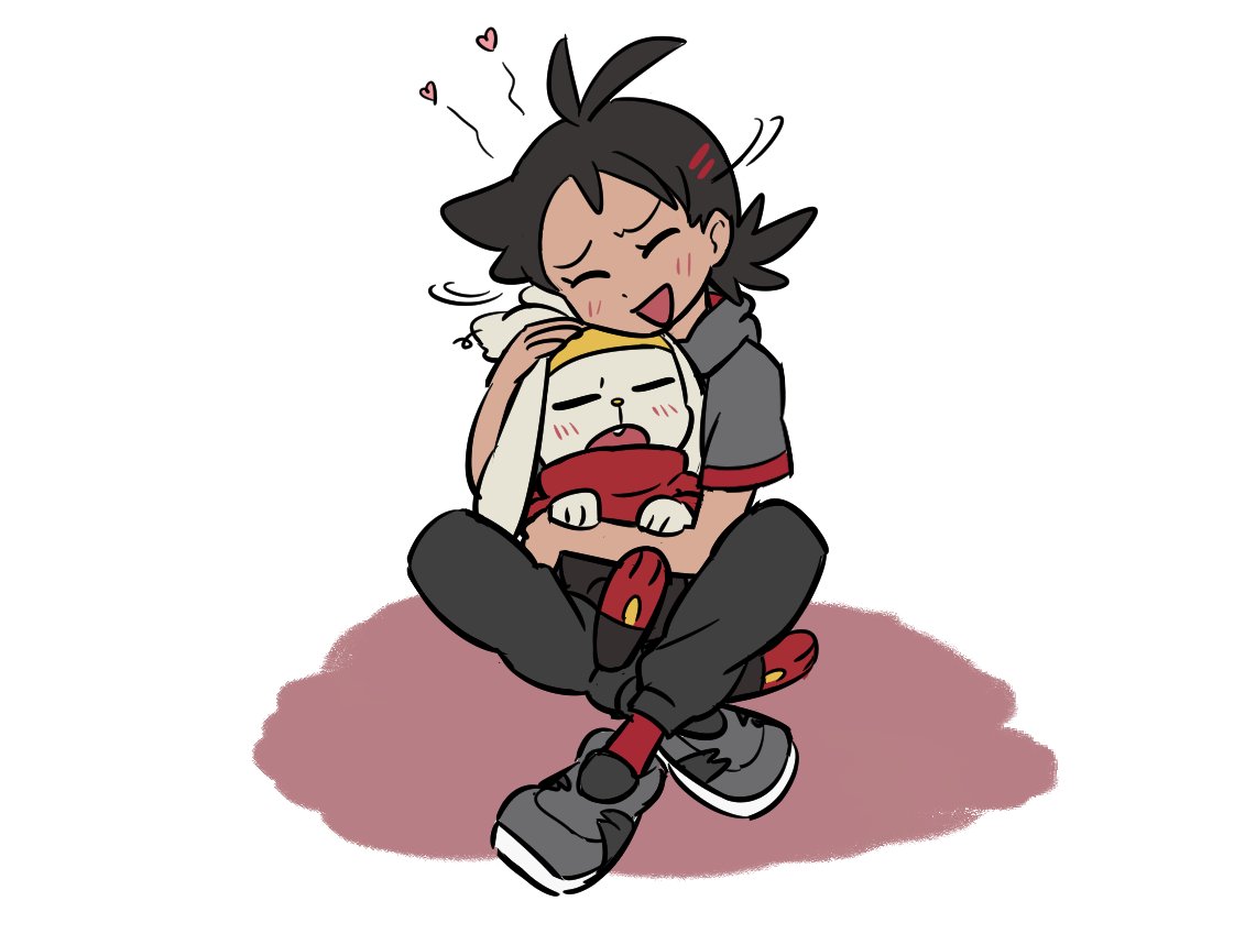 1boy :d antenna_hair black_hair closed_eyes commentary_request gen_8_pokemon goh_(pokemon) grey_footwear grey_shirt heart holding holding_pokemon hug light_blush male_focus medium_hair nintendo open_mouth pants pokemon pokemon_(anime) pokemon_(creature) pokemon_journeys raboot red_socks shirt shoes short_sleeves shuan_0420 sitting smile socks white_background