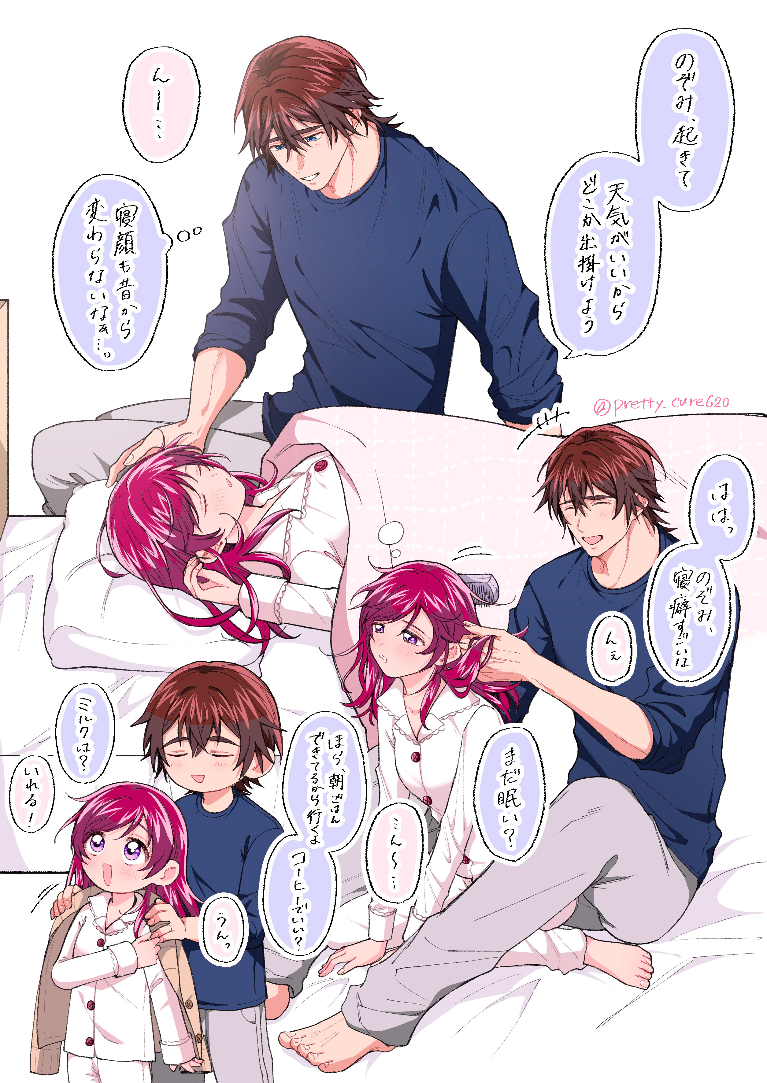 1boy 1girl absurdres bed bed_sheet blue_eyes blue_shirt blush brown_hair closed_eyes coco_(precure) comb grey_pants highres husband_and_wife jewelry kibou_no_chikara_otona_precure_'23 kokoda_kouji long_sleeves medium_hair non_(pretty_cure620) open_mouth pajamas pants pillow pink_eyes pink_hair precure ring shirt short_hair sleeping smile twitter_username wedding_ring white_pajamas yes!_precure_5 yes!_precure_5_gogo! yumehara_nozomi