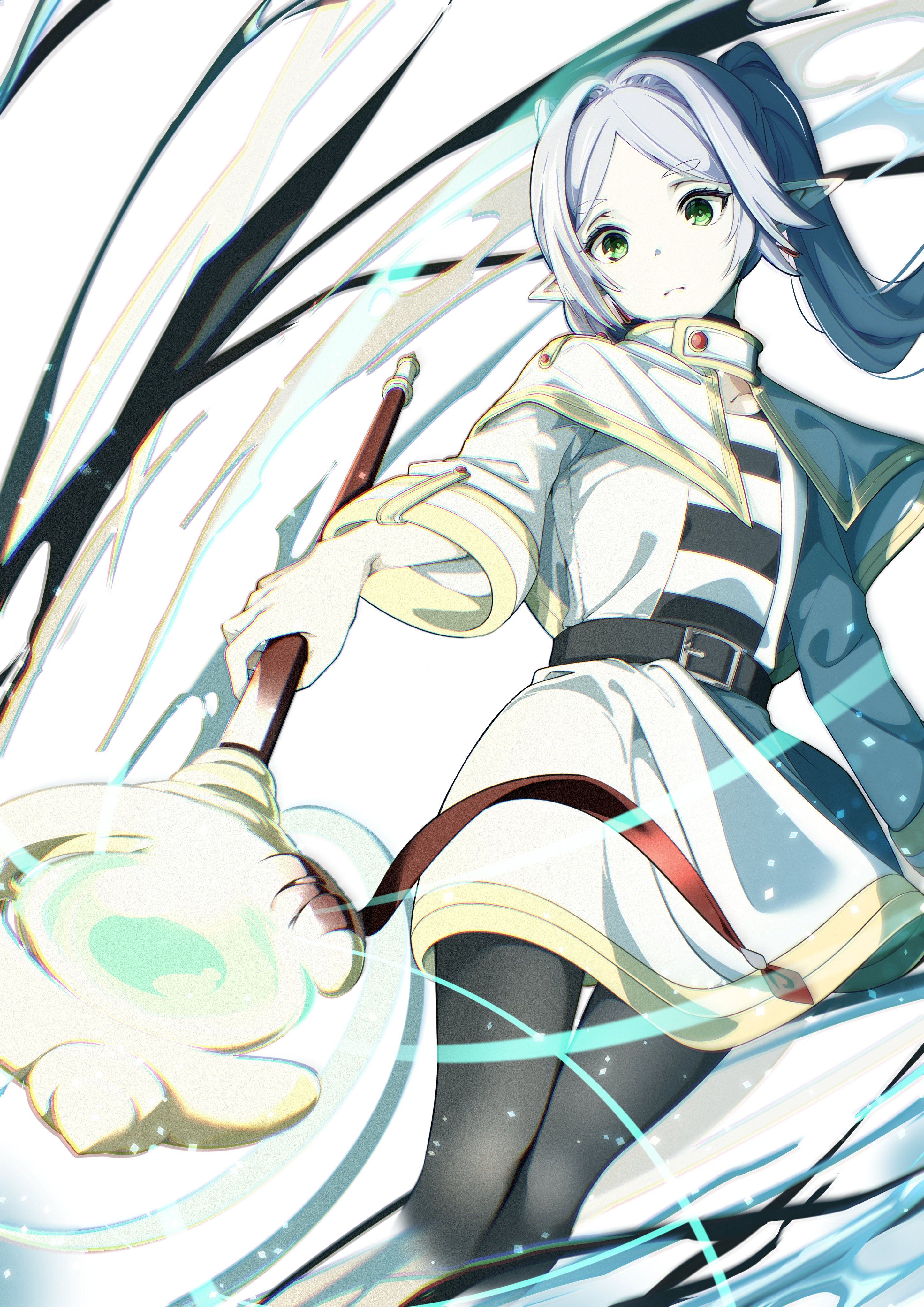 1girl absurdres black_leggings casting_spell elf feathermage frieren green_eyes highres holding holding_weapon leggings long_hair mage_staff pointy_ears sousou_no_frieren staff weapon white_hair