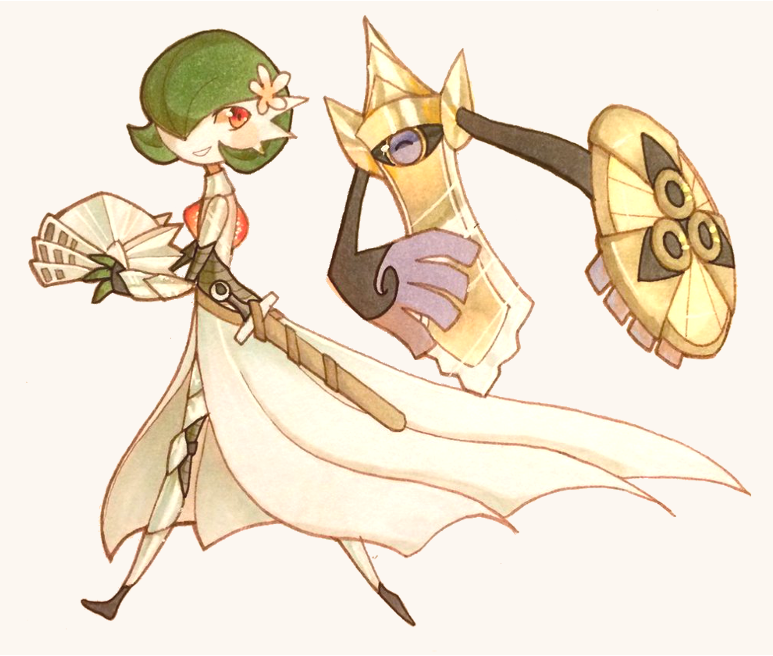 aegislash armor bob_cut colored_skin dress floating flower gardevoir gen_3_pokemon gen_6_pokemon green_hair green_skin hair_over_one_eye helm helmet holding holding_shield multicolored_skin nintendo one-eyed pink_eyes pokemon pokemon_(creature) purple_eyes scabbard sheath shield simple_background smile sword two-tone_skin weapon white_dress white_flower white_skin xyliaxart