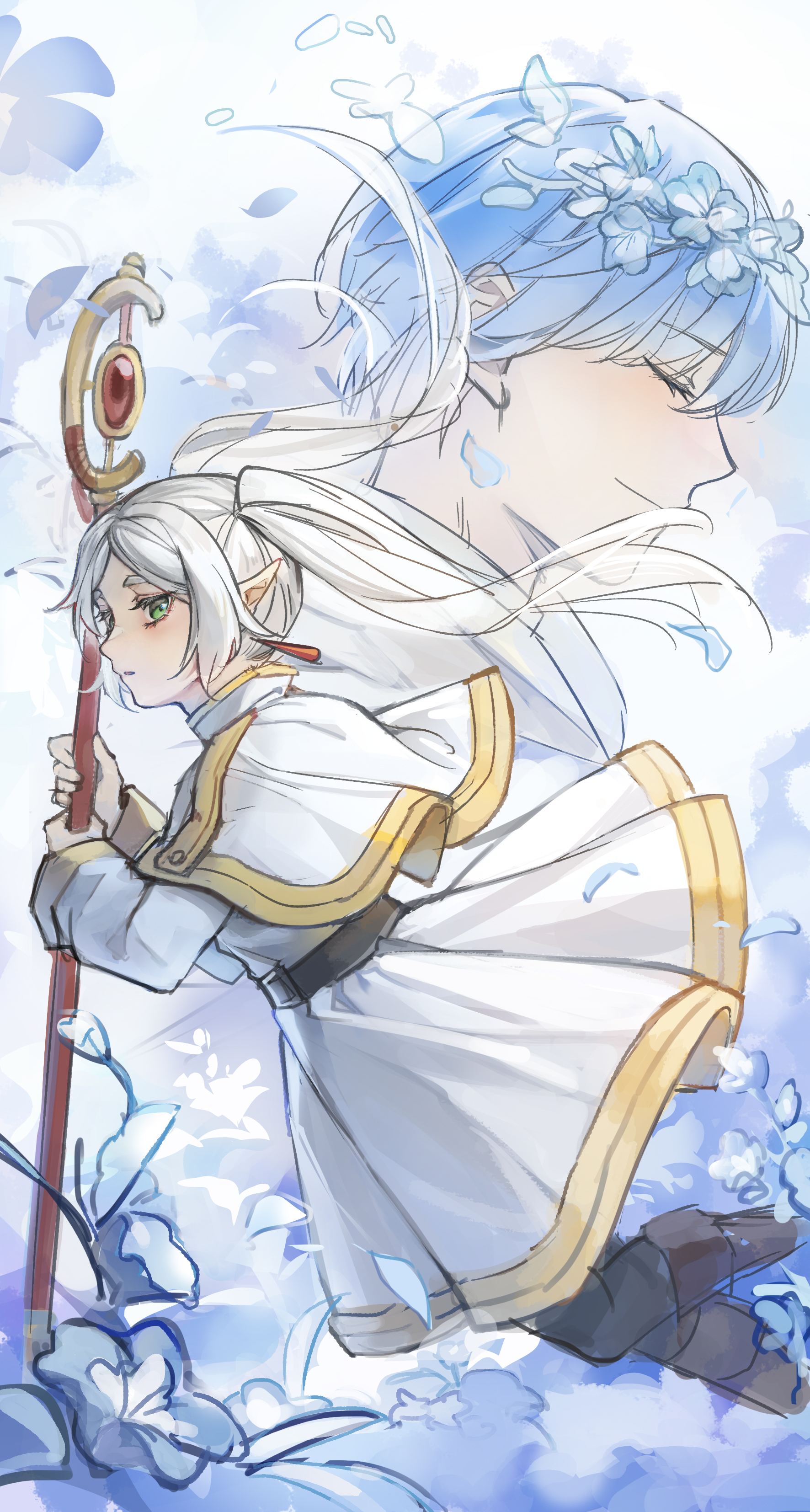 1boy 1girl absurdres belt black_belt black_pantyhose blue_flower blue_hair capelet chinese_commentary closed_eyes closed_mouth commentary_request dress earrings elf flower frieren green_eyes head_wreath highres himmel_(sousou_no_frieren) holding holding_staff jewelry long_hair long_sleeves pantyhose parted_lips pointy_ears profile short_hair smile sousou_no_frieren staff ta_ta_penny white_capelet white_dress white_hair