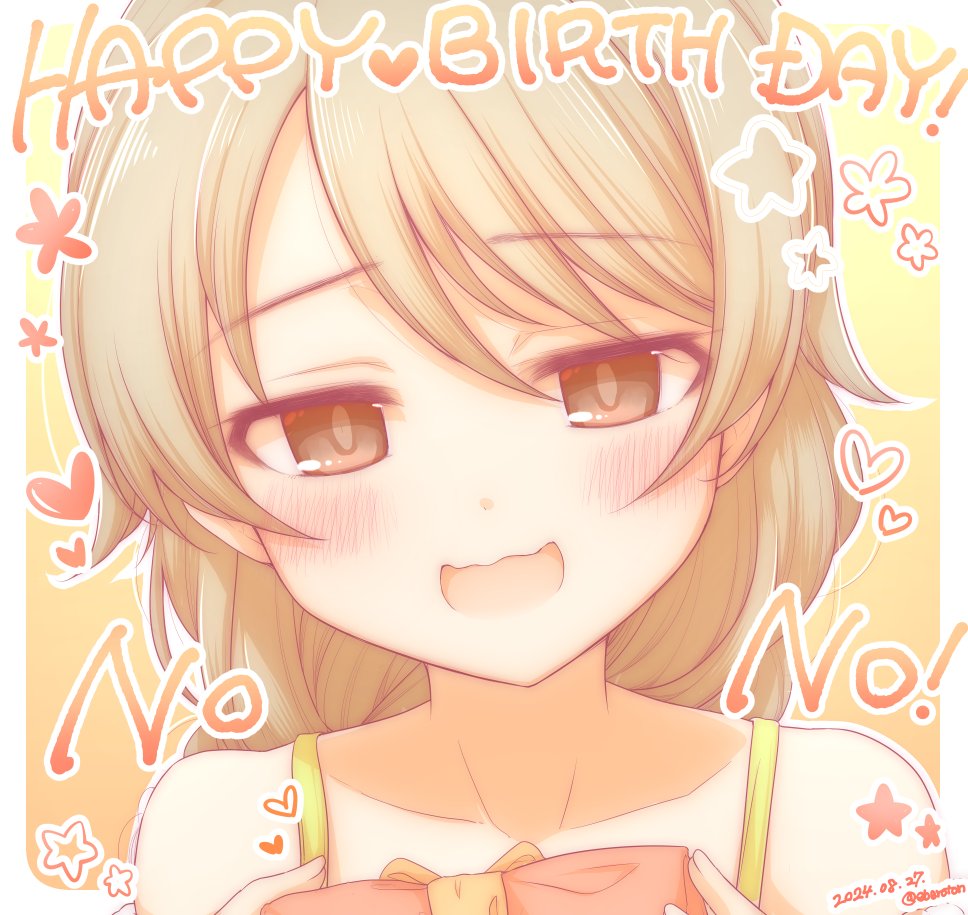 1girl blonde_hair blush brown_eyes close-up dress eberoton gift happy_birthday heart holding holding_gift idolmaster idolmaster_cinderella_girls long_hair morikubo_nono open_mouth smile solo upper_body