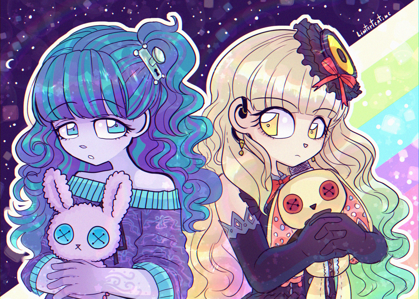 2girls blonde_hair colored_sclera colored_skin crossover curly_hair dress elbow_gloves gloves jewelry linterteatime long_hair mayu_(vocaloid) monster_girl monster_high monster_high_(g1) multiple_girls purple_hair purple_skin shirt stuffed_animal stuffed_rabbit stuffed_toy twyla_boogeyman very_long_hair vocaloid yellow_eyes