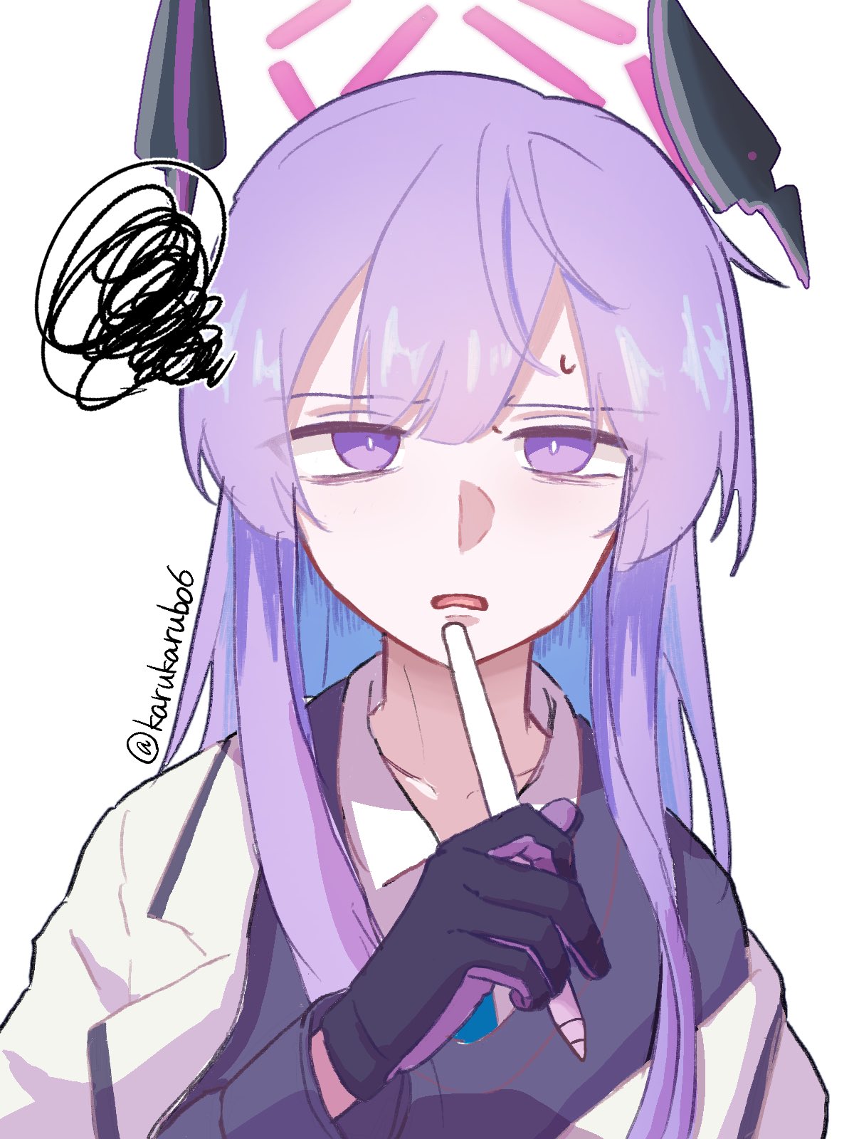1girl blue_archive commentary_request floating_headgear halo headgear highres holding holding_pen jacket karubo long_hair long_sleeves necktie open_mouth pen purple_eyes purple_hair scribble shirt simple_background small_sweatdrop solo twitter_username upper_body utaha_(blue_archive) white_background white_jacket