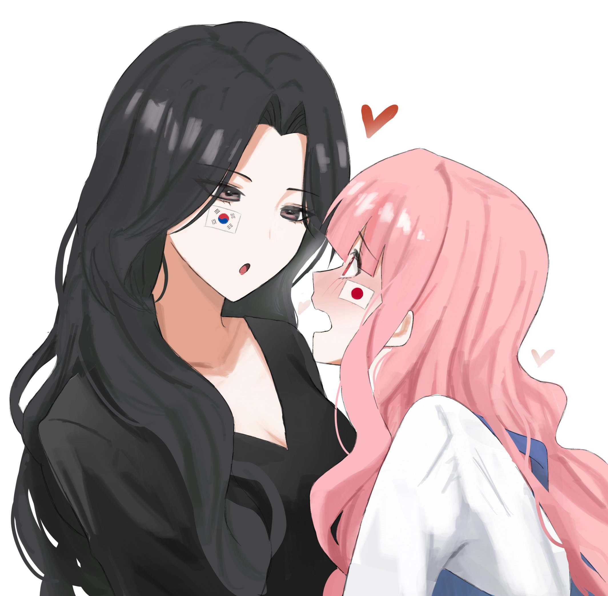2girls black_hair black_shirt blush breasts brown_eyes cleavage eye_contact heart highres japan-korea_yuri_(meme) japanese_flag long_hair looking_at_another meme multiple_girls open_mouth original parted_lips pink_hair red_eyes shirt simple_background south_korean_flag ulette upper_body white_background white_shirt yuri