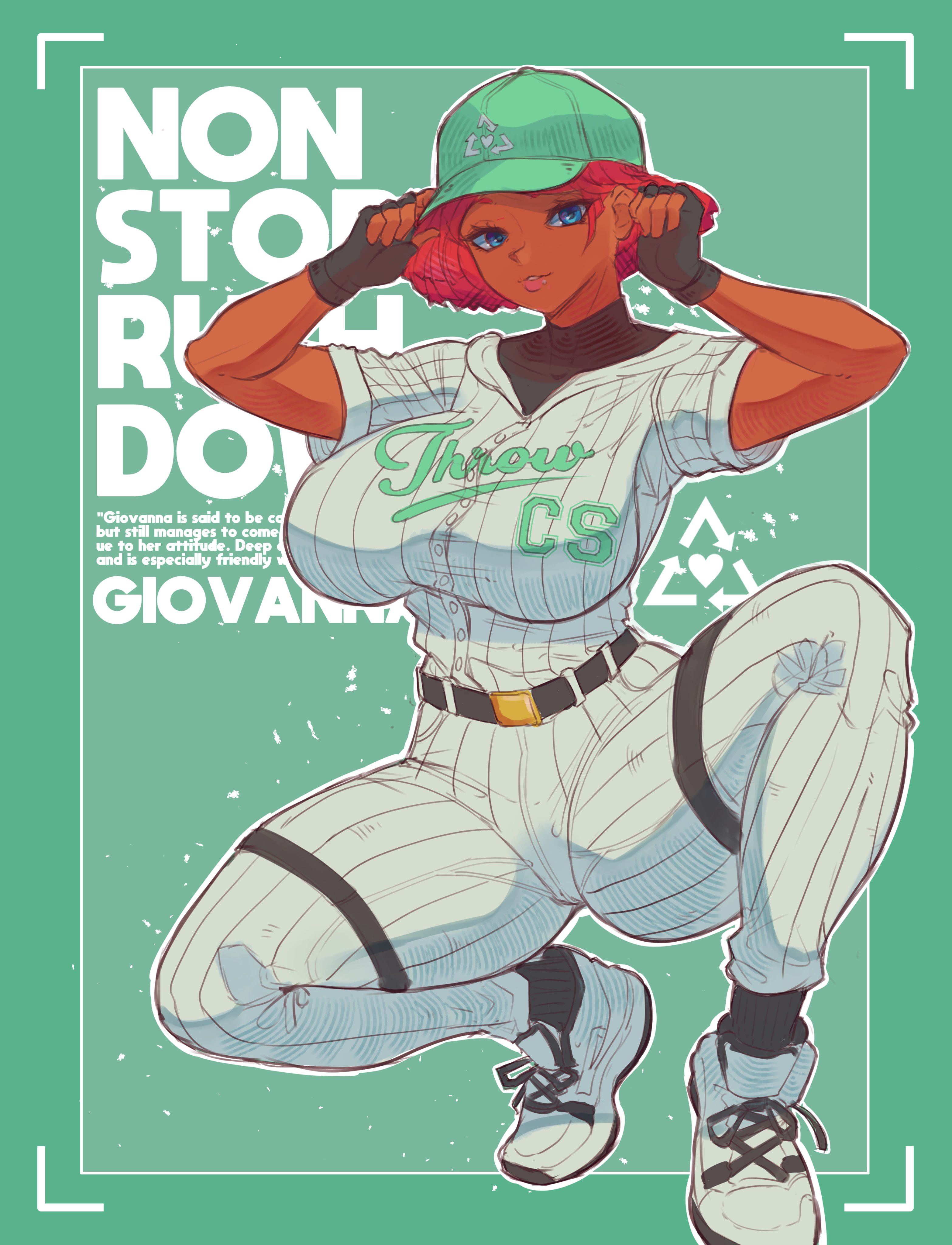 1girl absurdres adjusting_clothes adjusting_headwear arrow_(symbol) baseball_cap baseball_uniform black_gloves black_socks blue_eyes breasts character_name dark-skinned_female dark_skin english_text fingerless_gloves full_body giovanna_(guilty_gear) gloves green_background guilty_gear guilty_gear_strive hat highres huge_breasts impossible_clothes looking_at_viewer pink_lips pinstripe_pattern recycling_symbol red_hair shoes short_hair short_sleeves sneakers socks solo sportswear squatting taobaka thick_thighs thigh_strap thighs white_shoes