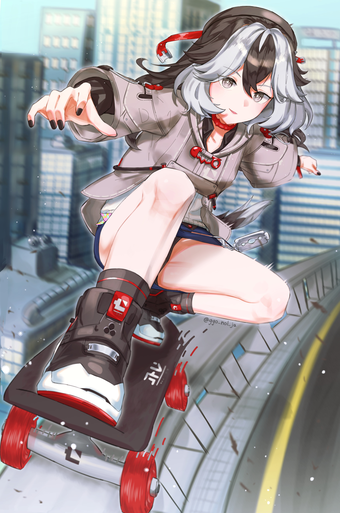 1girl black_footwear black_hair building city coralie_6626_planck coralie_6626_planck_(valkyrie_blastmetal) full_body ggo_nol_ja grey_eyes grey_jacket highres honkai_(series) honkai_impact_3rd jacket multicolored_hair railing skateboard skateboarding skyscraper solo two-tone_hair white_hair