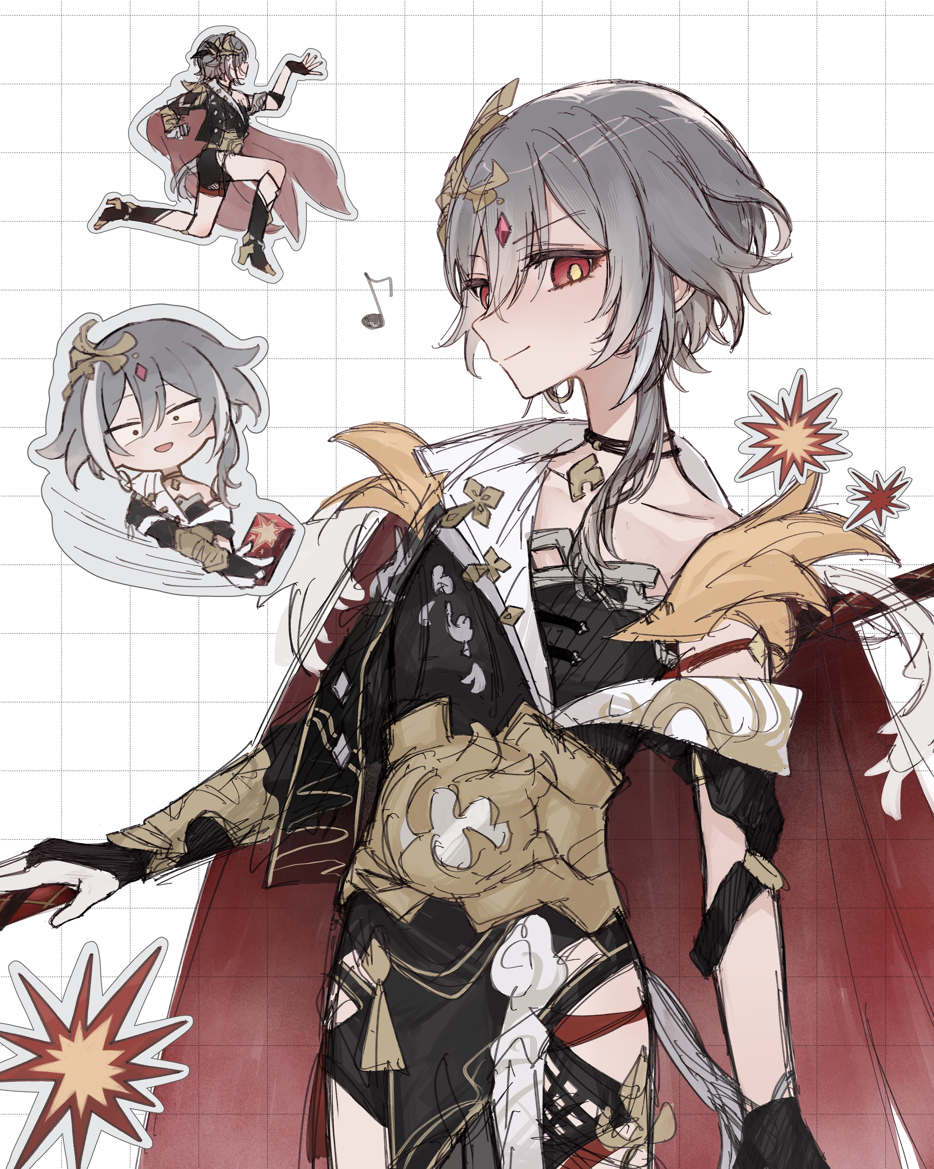 1girl absurdres black_choker black_dress cape chibi chibi_inset choker closed_mouth commentary_request cowboy_shot dress eighth_note gloves grey_hair grid_background hair_between_eyes hair_ornament herrscher_of_sentience highres honkai_(series) honkai_impact_3rd kubikori looking_at_viewer multiple_views musical_note official_alternate_hair_length official_alternate_hairstyle partial_commentary red_cape red_eyes short_hair single_off_shoulder smile