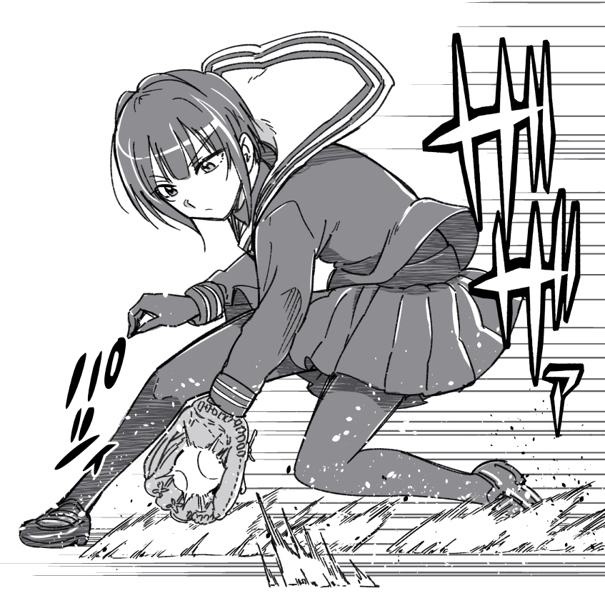 1girl ball baseball baseball_(object) baseball_glove bodystocking catching closed_mouth commentary_request dust frown full_body greyscale holding holding_ball idolmaster idolmaster_cinderella_girls loafers long_sleeves monochrome motion_lines on_one_knee playing_sports pleated_skirt school_uniform serafuku shirayuki_chiyo shirt shoes short_hair simple_background skirt sliding solo speed_lines taguchi_kenji_(omaep) v-shaped_eyebrows