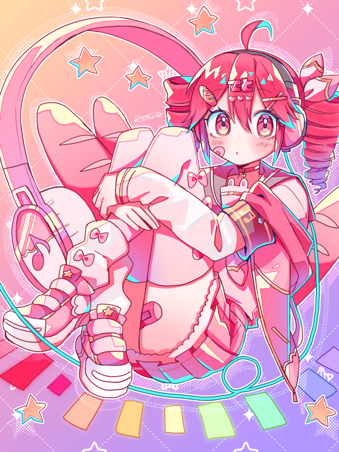 1girl :o ahoge alternate_costume armband baguette bandaid bandaid_on_cheek bandaid_on_face blush bread choker crossed_ankles drill_hair food full_body gradient_background hair_ornament hairclip headphones heart heart_choker hugging_own_legs jacket kasane_teto kasane_teto_(sv) looking_at_viewer parted_lips pink_jacket pink_shoes pink_skirt pink_thighhighs pleated_skirt red_choker red_eyes red_hair sailor_collar shoes skirt solo star_(symbol) synthesizer_v thighhighs twin_drills two-tone_background utau yuusuke-kun