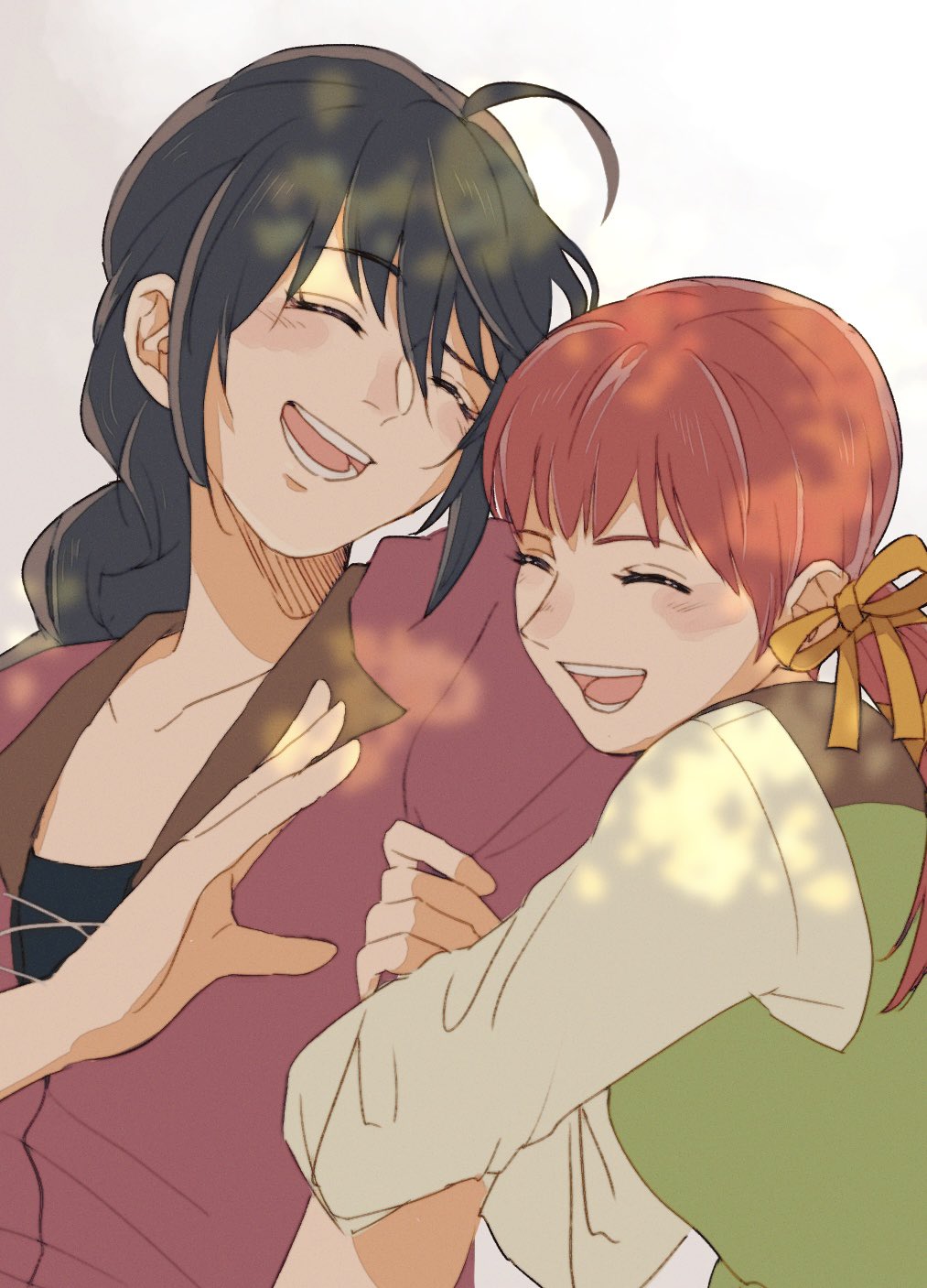 2girls ^_^ ahoge black_hair character_request closed_eyes commentary_request highres hug long_hair multiple_girls open_mouth oskn_tby red_hair ribbon simple_background smile tales_of_(series) tales_of_berseria teeth velvet_crowe velvet_crowe_(villager_clothes) white_background yellow_ribbon