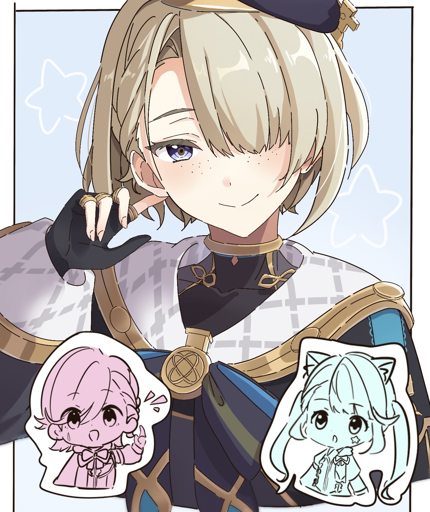 1girl 2boys beret black_gloves blonde_hair blue_eyes closed_mouth fingerless_gloves freminet_(genshin_impact) genshin_impact gloves hair_over_one_eye hat highres kisaragi_(kisaraggg_27) long_sleeves looking_at_viewer lynette_(genshin_impact) lyney_(genshin_impact) male_focus multiple_boys short_hair simple_background smile