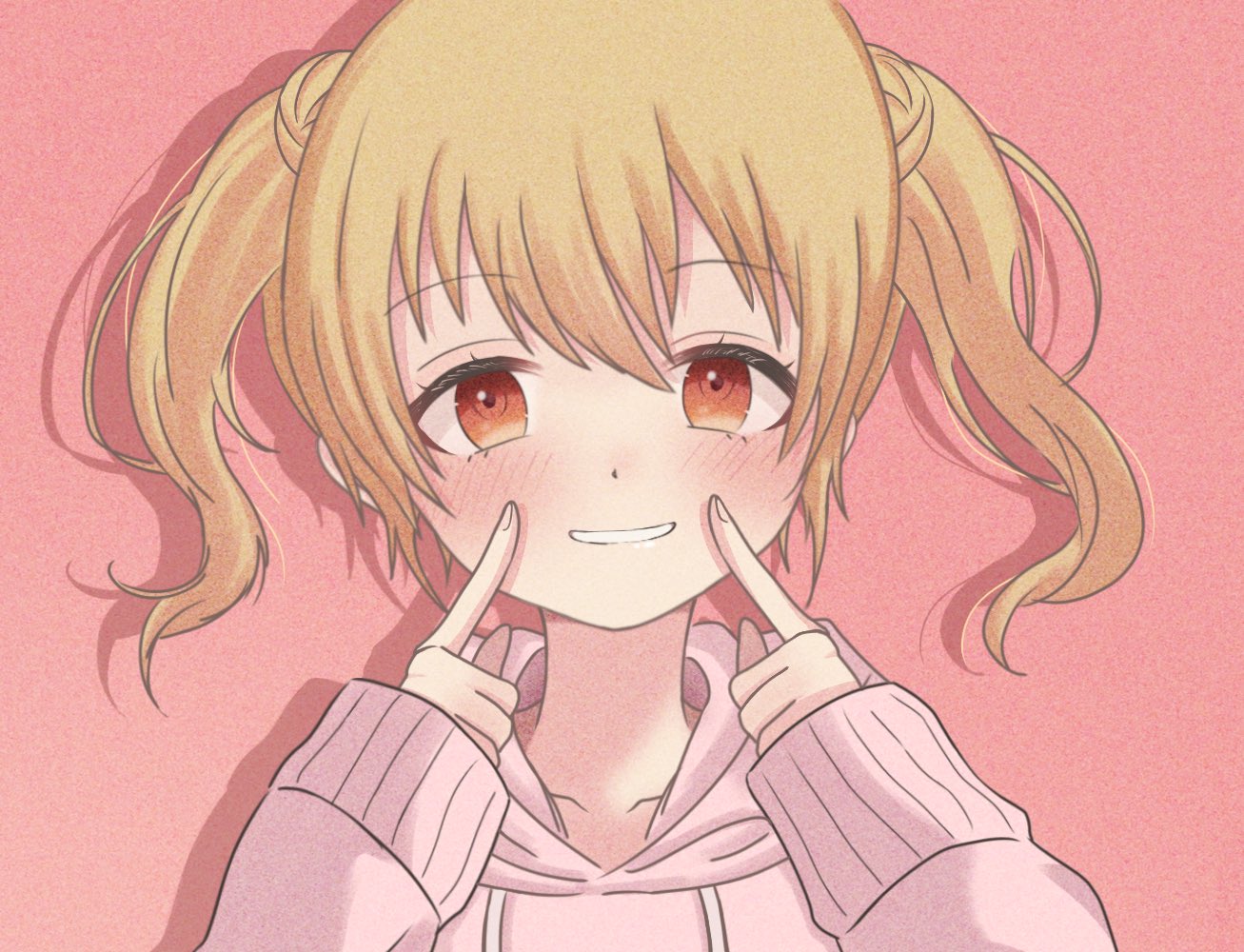 1girl blonde_hair blush collarbone commentary_request drop_shadow film_grain fingers_to_cheeks grin hood hoodie idoly_pride kawasaki_sakura_(idoly_pride) long_sleeves looking_at_viewer medium_hair nana_nagi orange_eyes parted_bangs pink_hoodie portrait sleeves_past_wrists smile solo twintails