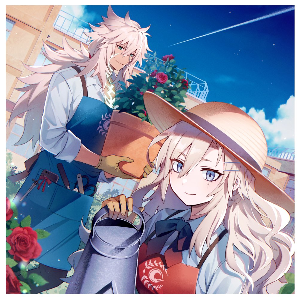 1boy 1girl blue_eyes bow bowtie brown_gloves building cellphone chaldea_logo cloud cloudy_sky collared_shirt fate/grand_order fate_(series) flower gardening gloves glowing glowing_markings green_eyes hat holding holding_plant holding_watering_can kriemhild_gretchen light_smile long_hair meiji_ken mole mole_under_eye official_art phone plant potted_plant red_flower red_rose rose shirt shooting_star siegfried_(fate) sky smartphone smile star_(sky) sun_hat tools watering_can white_hair white_shirt