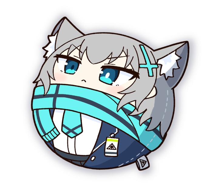 achilles_(yosshyachillesd) animal_ear_fluff animal_ears blue_archive blue_eyes blue_scarf closed_mouth cross cross_hair_ornament extra_ears grey_hair hair_ornament inverted_cross no_humans scarf shiroko_(blue_archive) simple_background souvenir_doll_(blue_archive) stuffed_toy white_background wolf_ears