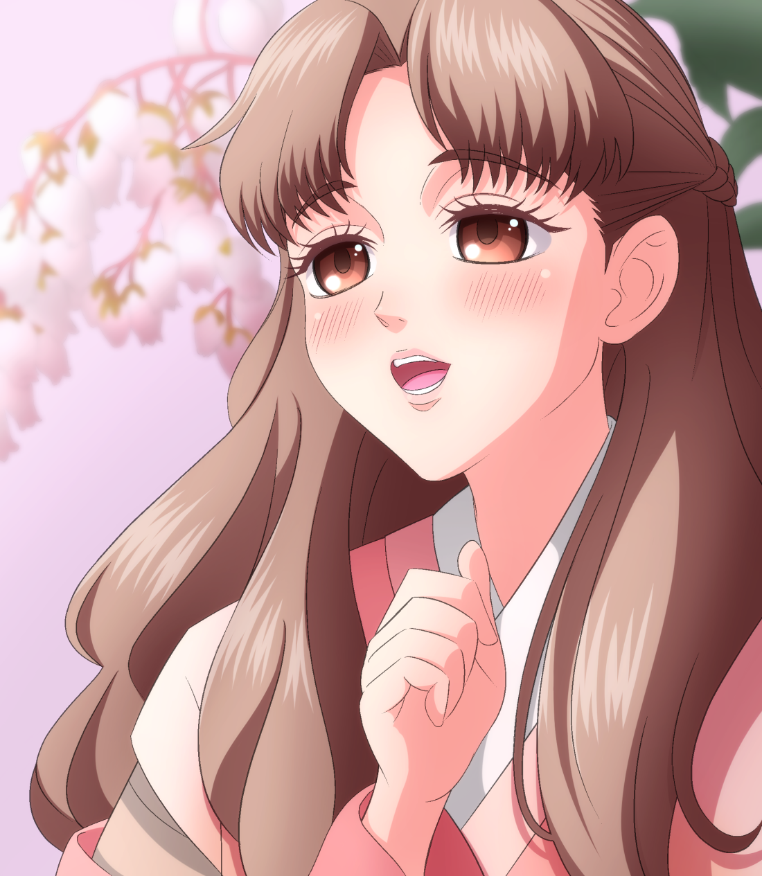 1girl :o asebi_(yatagarasu_series) blush braid brown_eyes brown_hair flower hand_up highres jougenmushi karasu_wa_aruji_wo_erabanai long_hair looking_at_viewer open_mouth parted_bangs pink_background solo upper_body