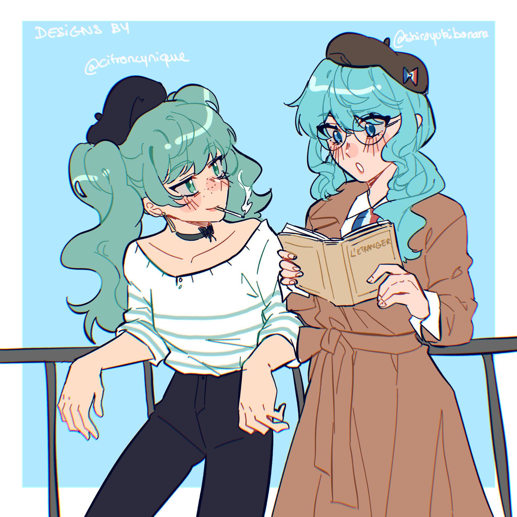 2girls aqua_hair beret black_choker black_hat black_pants blue_background blush book brown_coat choker coat cowboy_shot earrings freckles glasses hat hatsune_miku highres holding holding_book jewelry long_hair long_sleeves multiple_girls pants shirayuki_banana shirt shirt_tucked_in smoking striped_clothes striped_shirt the_stranger_(camus) twintails vocaloid worldwide_miku