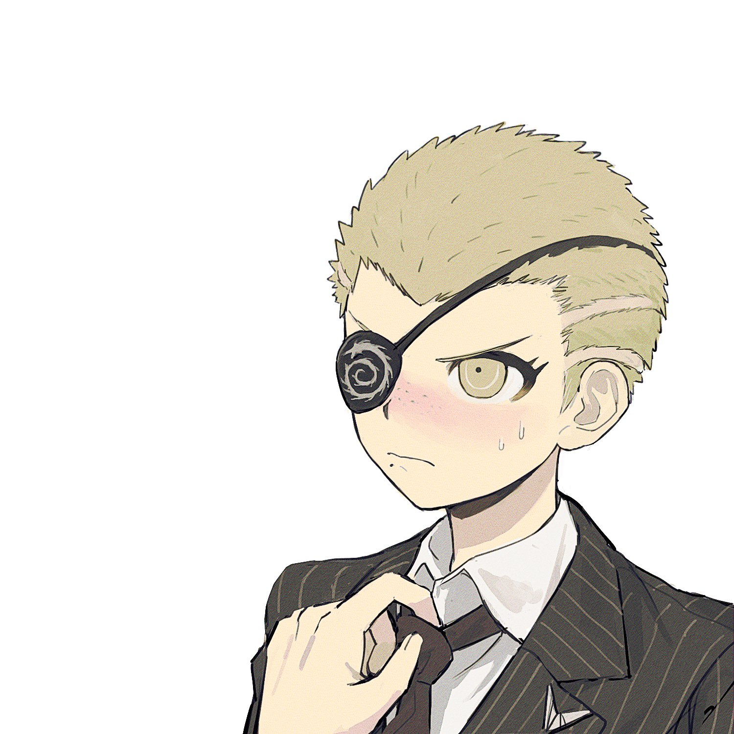 1boy black_jacket black_necktie blonde_hair casssstle12 collared_shirt danganronpa_(series) danganronpa_2:_goodbye_despair eyepatch freckles frown hand_up highres jacket kuzuryu_fuyuhiko male_focus necktie portrait shirt short_hair simple_background solo striped_clothes striped_jacket sweat white_background white_shirt yellow_eyes