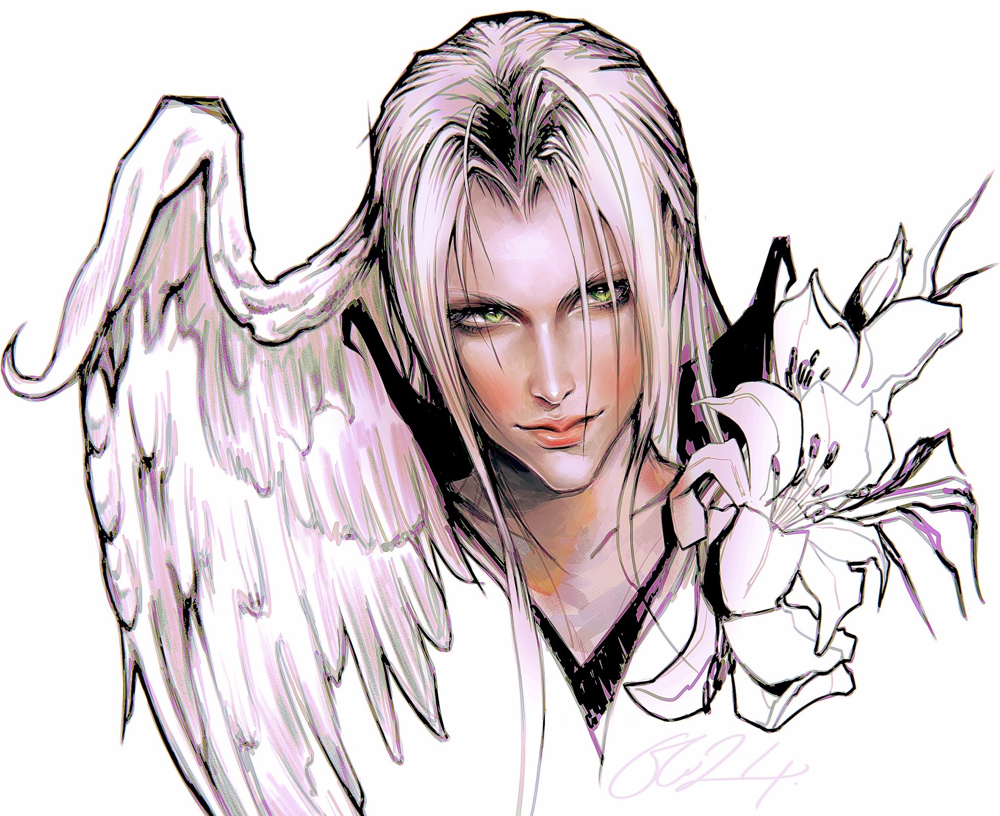 1boy closed_mouth feathered_wings final_fantasy final_fantasy_vii flower green_eyes highres lily_(flower) long_bangs long_hair male_focus oluyemiart parted_bangs sephiroth signature single_wing slit_pupils smile solo upper_body white_background white_flower white_hair white_wings wings
