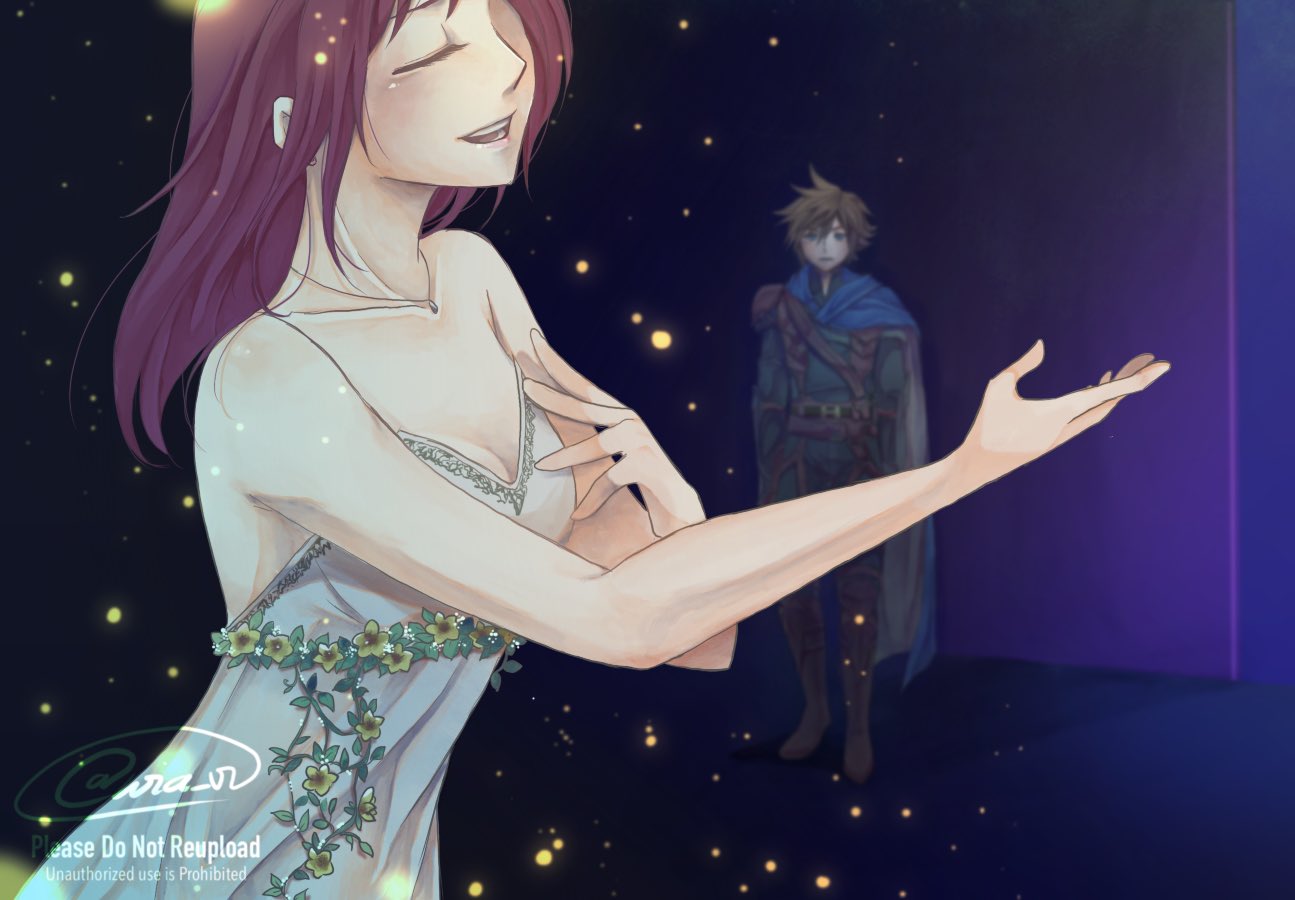 1boy 1girl aerith_gainsborough aerith_gainsborough_(cosplay) aerith_gainsborough_(white_floral_dress) armor bare_arms bare_shoulders blue_cloak boots breasts brown_armor brown_footwear brown_hair cleavage cloak closed_eyes cloud_strife cloud_strife_(alphreid_costume) cloud_strife_(cosplay) cosplay dress dress_flower final_fantasy final_fantasy_vii final_fantasy_vii_rebirth final_fantasy_vii_remake flower gold_saucer gold_trim hand_on_own_chest jewelry kairi_(kingdom_hearts) kingdom_hearts kingdom_hearts_ii leather_armor medium_breasts medium_hair music necklace open_mouth outstretched_arm red_hair short_hair signature singing smile sora_(kingdom_hearts) spiked_hair strapless strapless_dress upper_body white_dress wia_vi yellow_flower