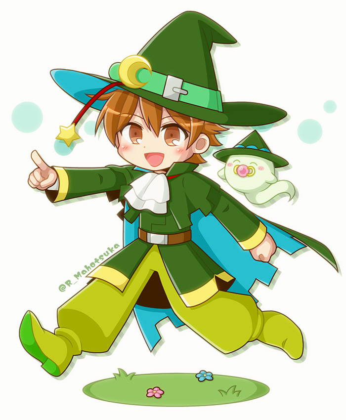 1boy :d aqua_cape artist_name ascot brown_eyes cape clenched_hand coat creature cropped_jacket deformed drop_shadow faux_figurine flipped_hair full_body ghost green_cape green_coat green_footwear green_hat green_jacket green_pants happy hat jacket light_blush light_brown_hair long_sleeves looking_ahead male_focus matthew_(puyopuyo) midair open_mouth outstretched_arm pants pointed_footwear pointing puyopuyo puyopuyo_quest r_mahotsuka running second-party_source short_hair side-by-side smile solo two-sided_cape two-sided_fabric white_ascot white_background witch_hat