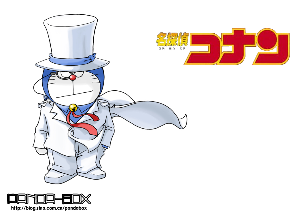 1boy artist_name cape closed_mouth copyright_name cosplay doraemon doraemon_(character) full_body hat kaitou_kid kaitou_kid_(cosplay) looking_at_viewer magic_kaito male_focus meitantei_conan monocle pandabox pants shirt simple_background solo standing third-party_source top_hat watermark web_address white_background white_cape white_hat white_pants white_shirt