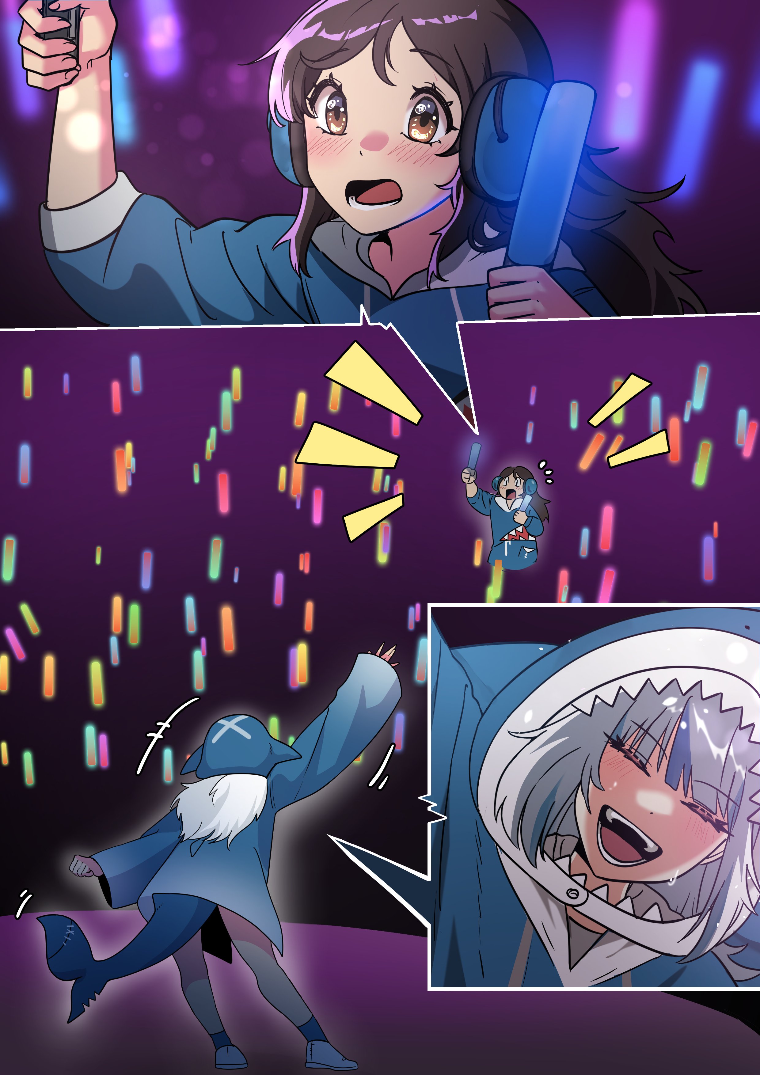 2girls absurdres animal_costume animal_hood blue_hair blue_hoodie blush brown_eyes brown_hair closed_eyes cosplay fins fish_tail gawr_gura gawr_gura_(1st_costume) gawr_gura_(cosplay) glowstick grey_hair headphones highres holding holding_glowstick hololive hololive_english hood hoodie long_hair looking_at_viewer medium_hair multiple_girls open_mouth penlight_(glowstick) rait_visual_works real_life shark_costume shark_girl shark_hood shark_tail shoes smile sneakers tail virtual_youtuber waving