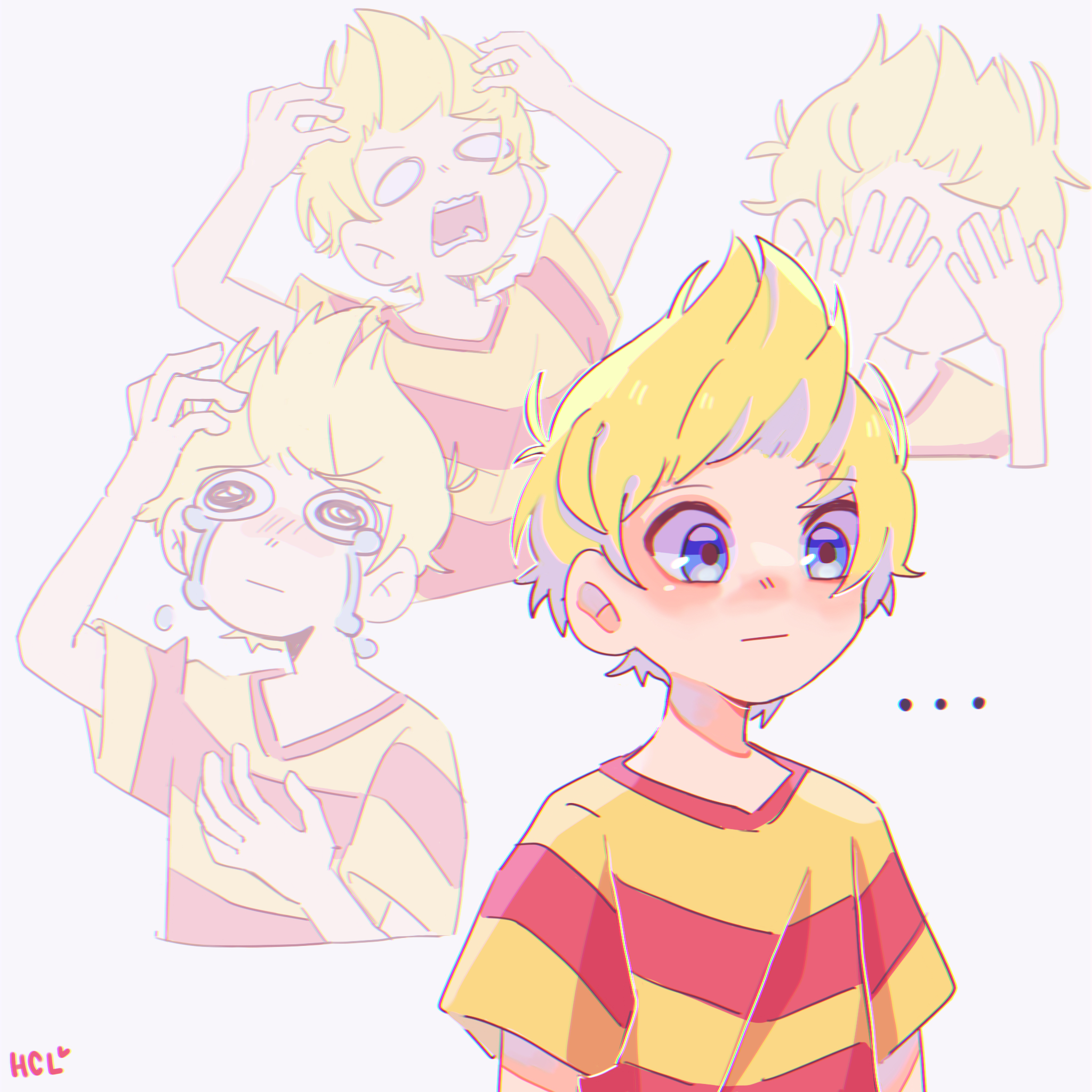 ahoge antenna_hair blonde_hair blue_eyes highres lucas_(mother_3) male_focus mother_(series) mother_3 multiple_persona nintendo open_mouth pinkukirby shirt short_hair short_sleeves simple_background smile solo striped_clothes striped_shirt