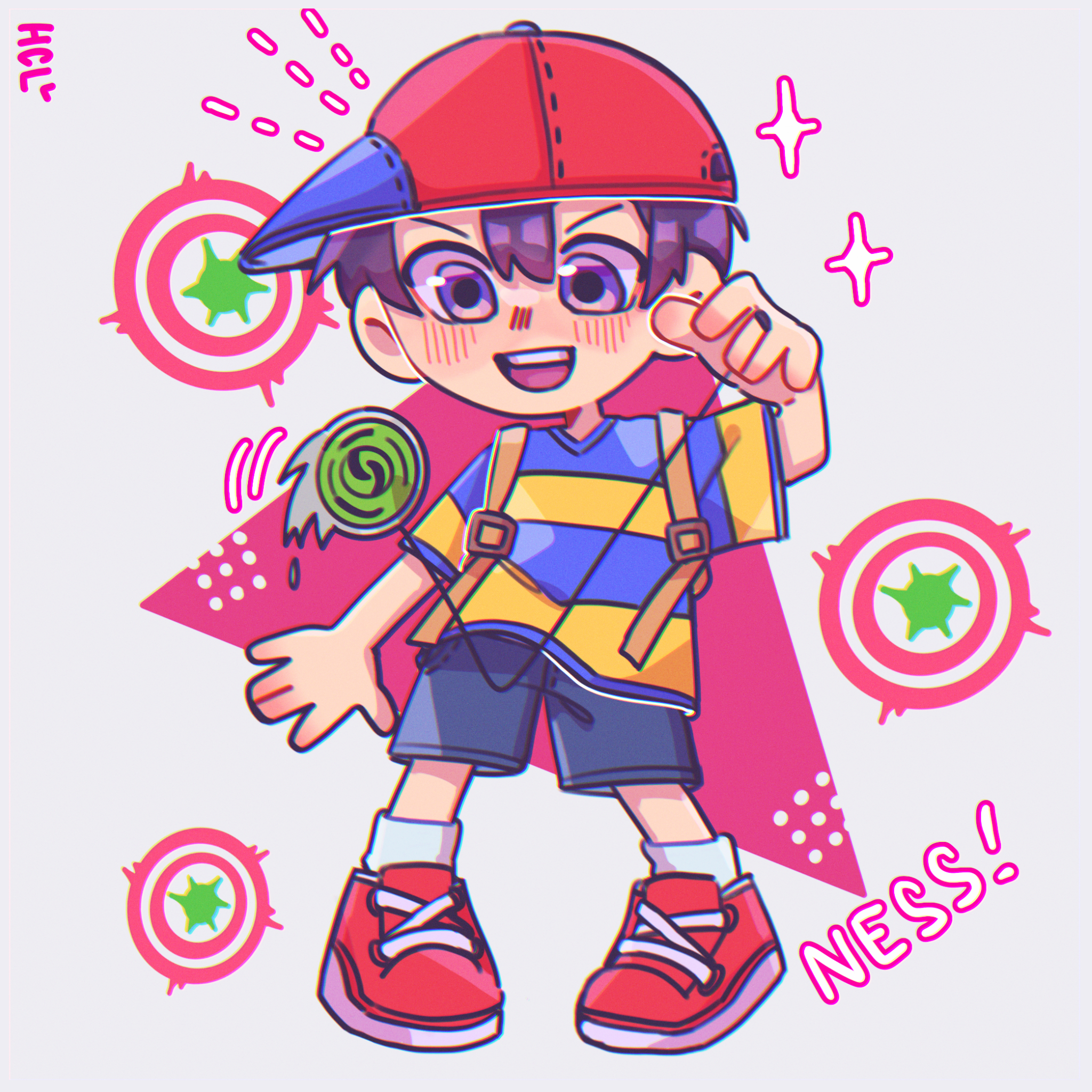 baseball_cap black_hair blonde_hair blue_eyes blue_shorts hat highres holding male_focus mother_(series) mother_2 ness_(mother_2) nintendo open_mouth pinkukirby shirt short_hair shorts smile solo striped_clothes striped_shirt yo-yo