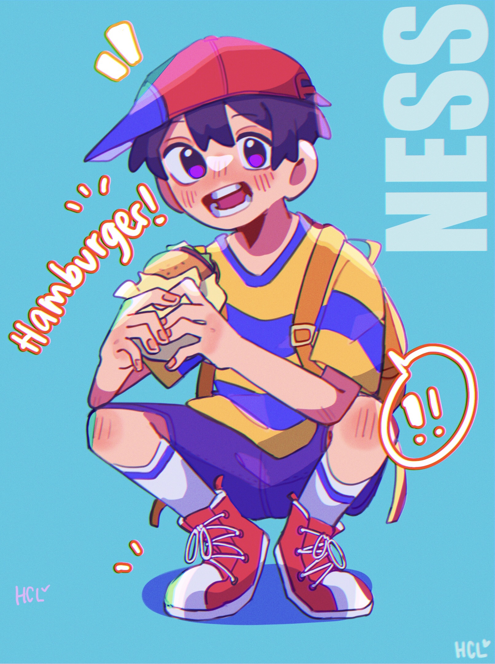 baseball_cap black_hair blonde_hair blue_eyes blue_shorts eating hat highres holding male_focus mother_(series) mother_2 ness_(mother_2) nintendo open_mouth pinkukirby shirt short_hair shorts smile solo striped_clothes striped_shirt