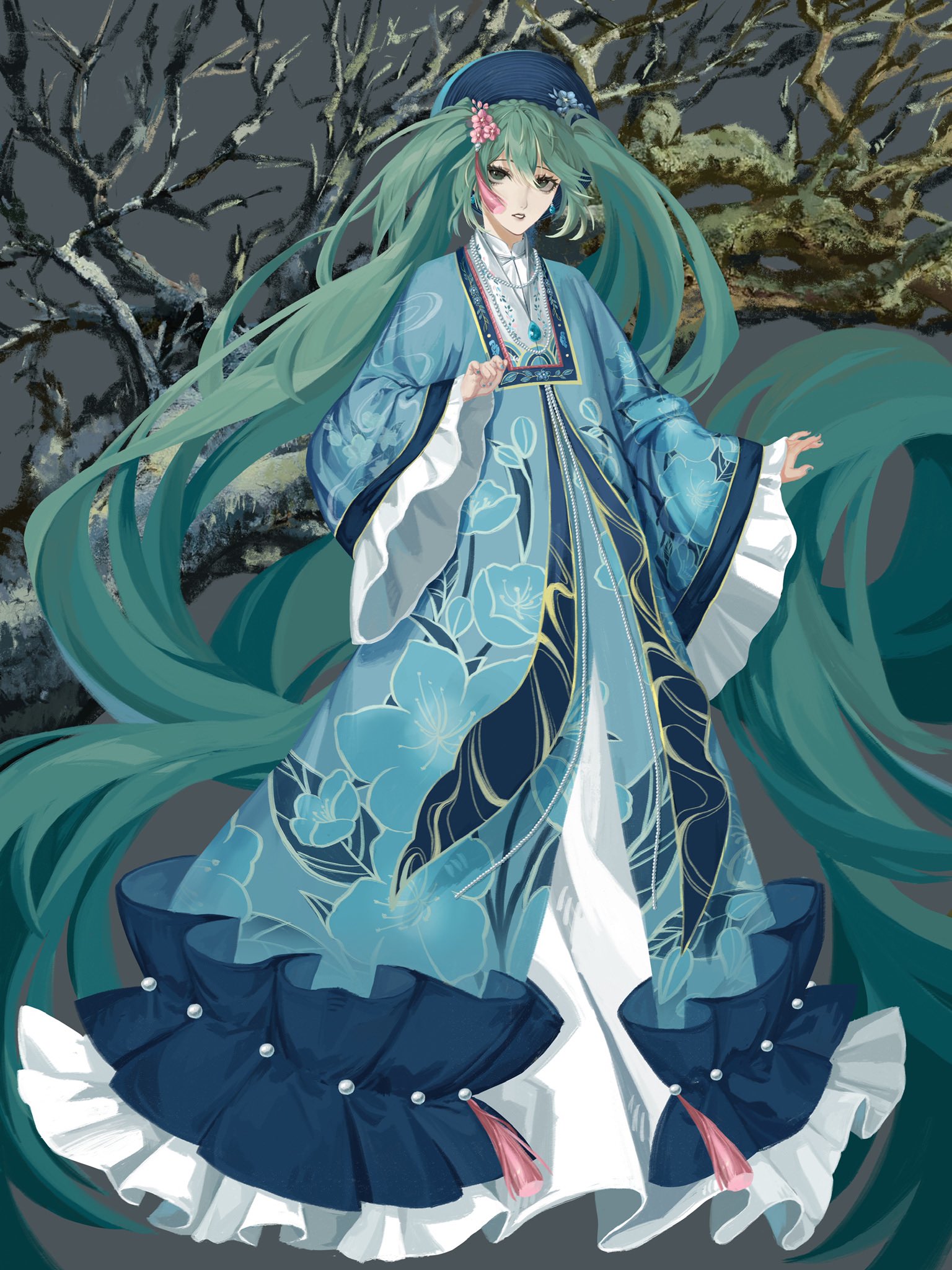 1girl absurdly_long_hair aqua_hair blue_flower ci_nn dress flower frilled_dress frills full_body green_eyes hair_flower hair_ornament hatsune_miku highres jewelry long_hair long_sleeves necklace pink_flower print_dress solo thanh_mai_miku tree very_long_hair vietnam vietnamese_clothes vocaloid wide_sleeves worldwide_miku