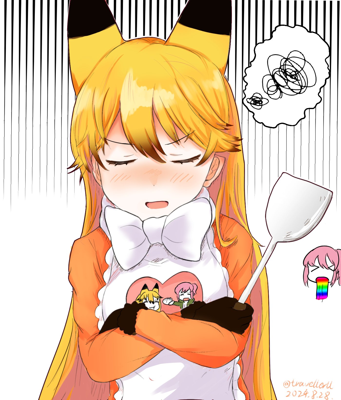! >_< 2girls animal_ears apron blush bow bowtie brown_fur brown_gloves closed_eyes crossed_arms ezo_red_fox_(kemono_friends) fox_ears fox_girl fur_trim gloves heart highres jacket kemono_friends long_hair multiple_girls nana_(kemono_friends) open_mouth orange_eyes orange_hair orange_jacket short_hair side_ponytail spatula travellerll vomiting_rainbows white_apron white_bow white_bowtie