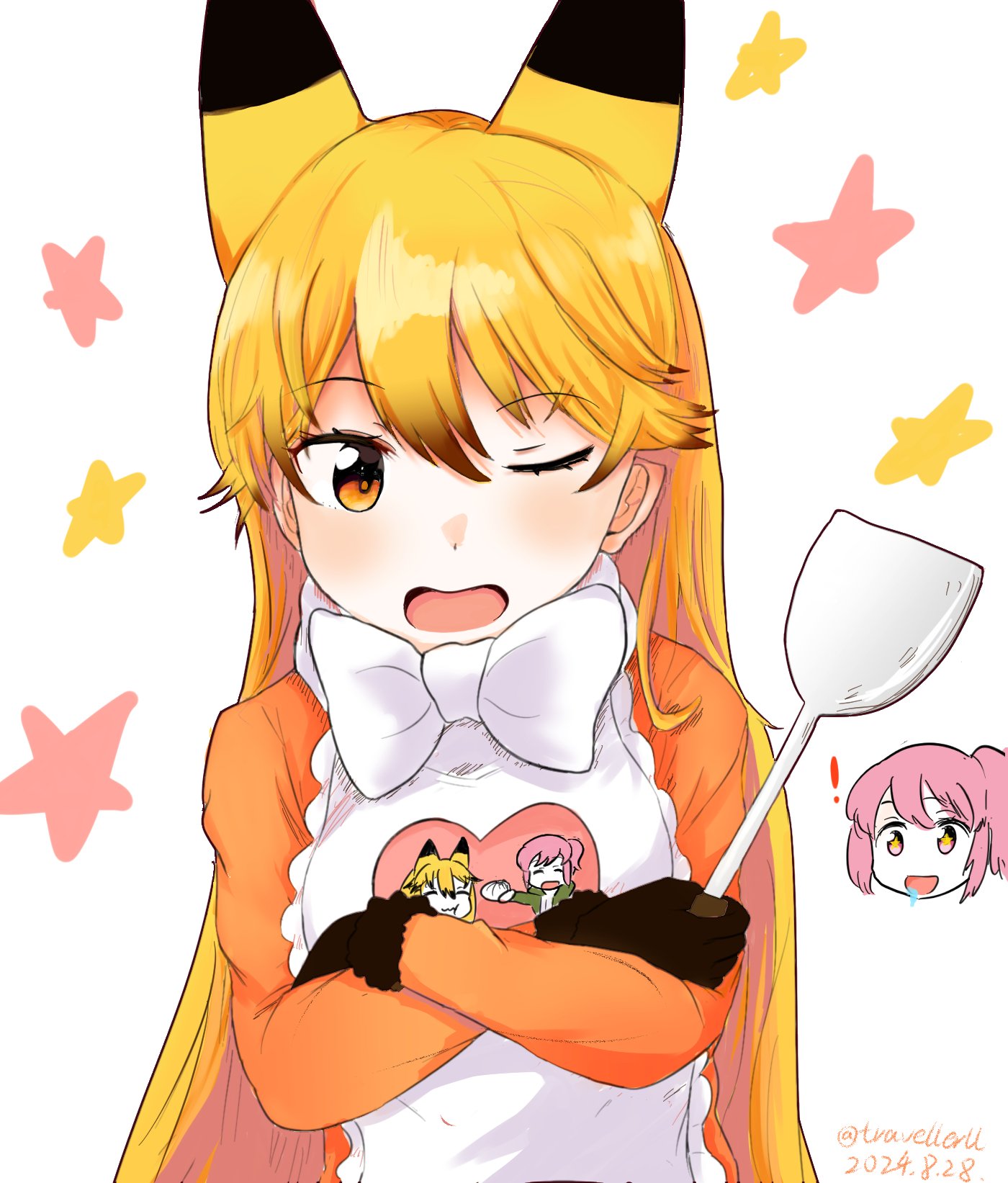 ! 2girls animal_ears apron blush bow bowtie brown_fur brown_gloves crossed_arms ezo_red_fox_(kemono_friends) fox_ears fox_girl fur_trim gloves heart highres jacket kemono_friends long_hair multiple_girls nana_(kemono_friends) one_eye_closed open_mouth orange_eyes orange_hair orange_jacket saliva short_hair side_ponytail spatula travellerll white_apron white_bow white_bowtie