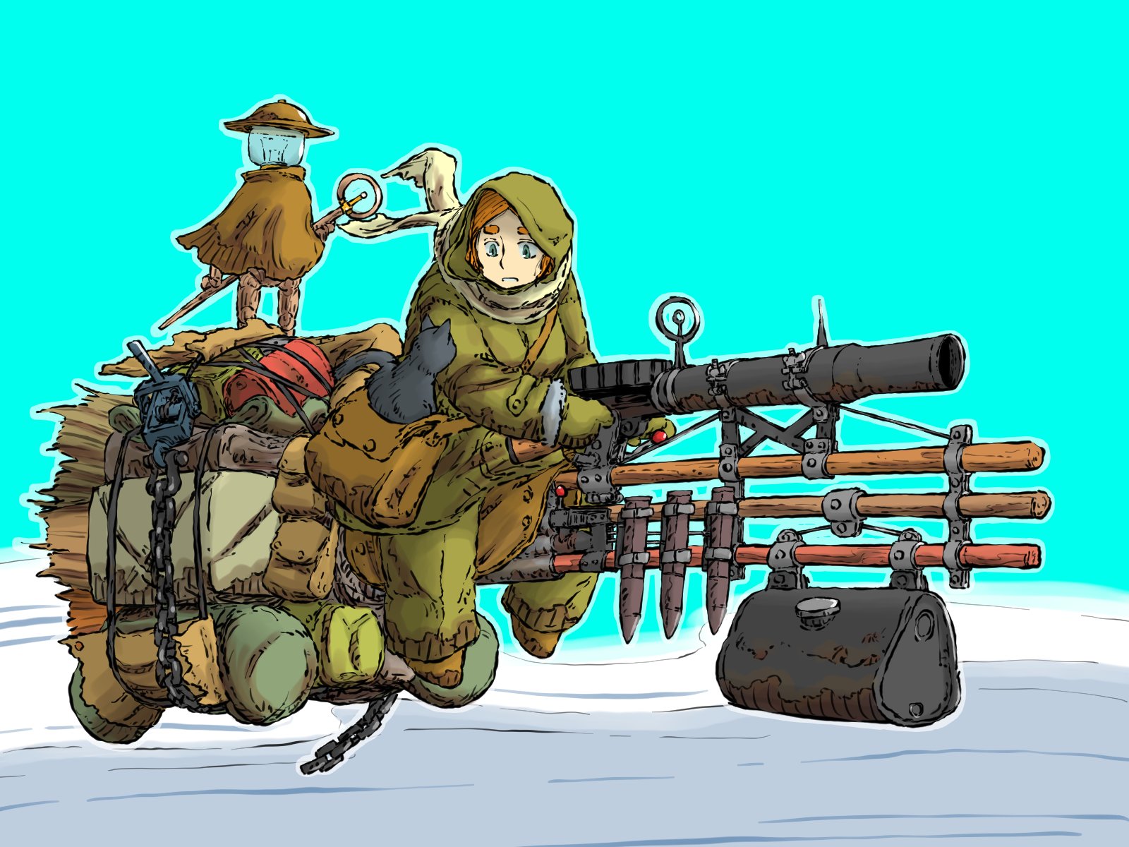 1girl above_clouds blue_eyes blue_sky brodie_helmet broom broom_riding brown_hair chain cloud cloudy_sky coat combat_helmet drum_magazine golem green_coat gun helmet highres lewis_gun light_machine_gun lock machine_gun magazine_(weapon) original robot scarf sky solo weapon white_scarf yabarn