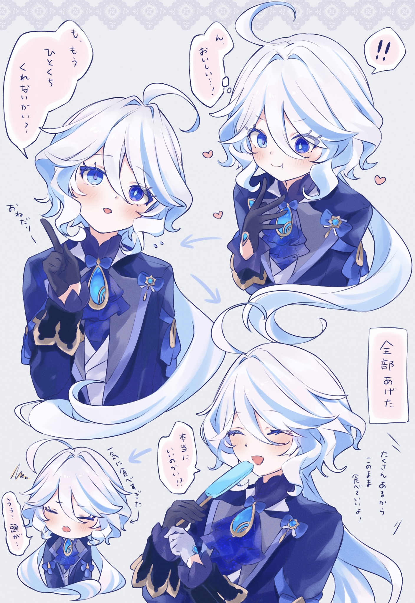 ! !! 1girl ahoge ascot asymmetrical_gloves black_gloves blue_ascot blue_eyes blue_hair blue_jacket blush brooch commentary_request engasaki_sakura food furina_(genshin_impact) genshin_impact gloves heterochromia highres holding holding_food holding_popsicle jacket jewelry long_hair long_sleeves mismatched_gloves multicolored_hair multiple_views open_mouth ouji_fashion ponytail popsicle smile spoken_exclamation_mark translation_request two-tone_hair white_gloves white_hair