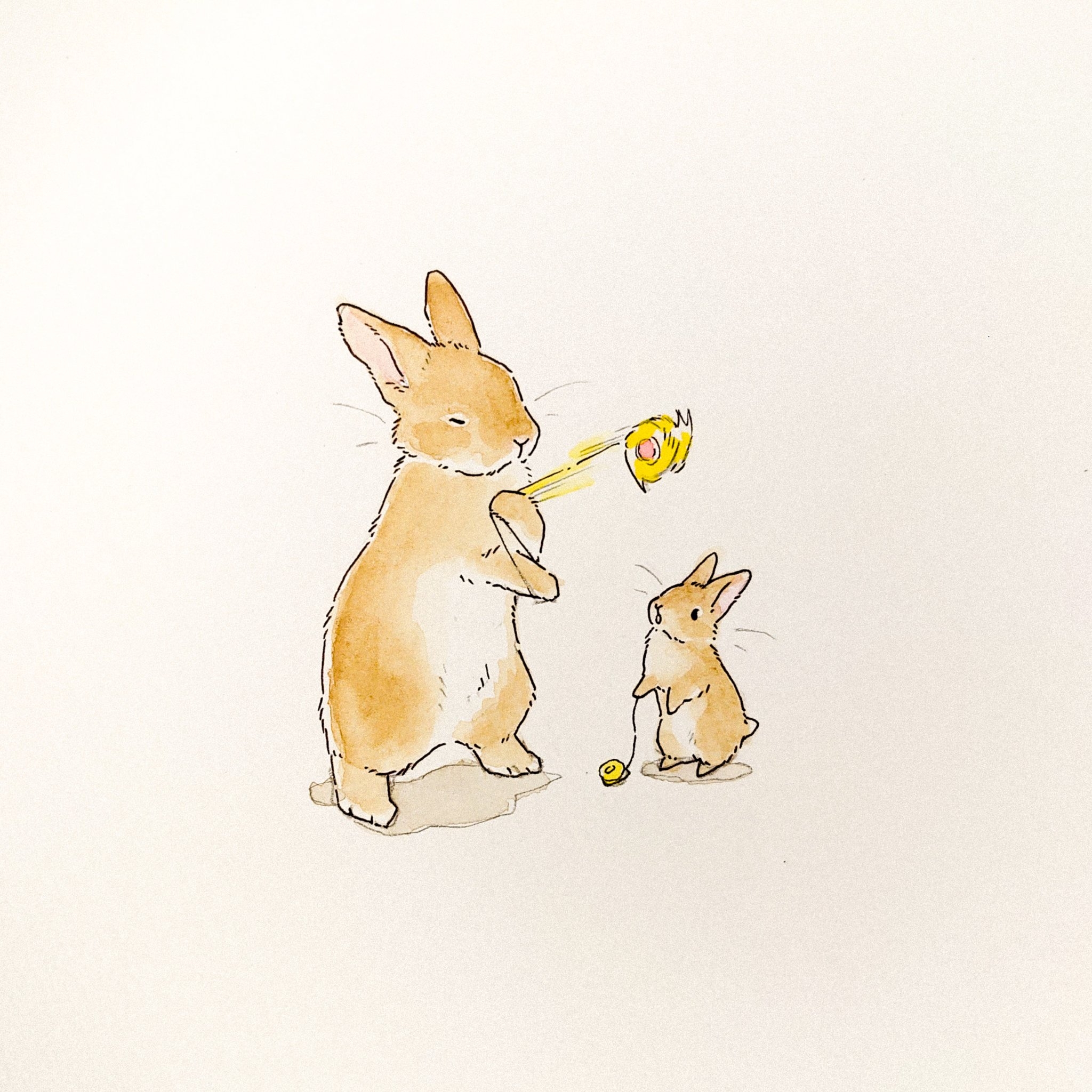 animal animal_focus berry_jou grey_background highres holding holding_toy no_humans original rabbit simple_background toy traditional_media yo-yo
