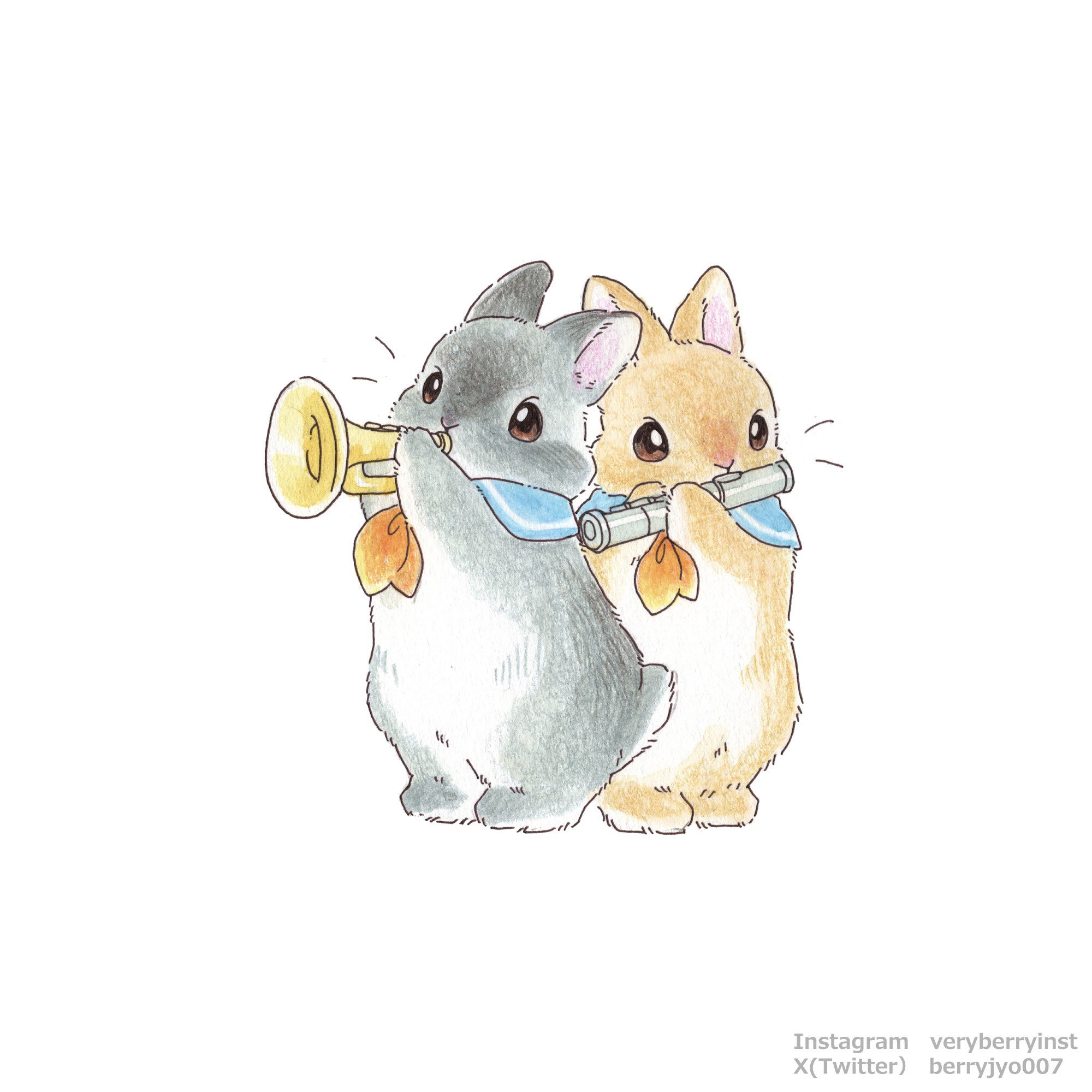 animal animal_ears animal_focus artist_name berry_jou blue_sailor_collar flute highres horn_(instrument) instrument music neckerchief no_humans orange_neckerchief original playing_flute playing_instrument rabbit rabbit_ears sailor_collar simple_background traditional_media white_background