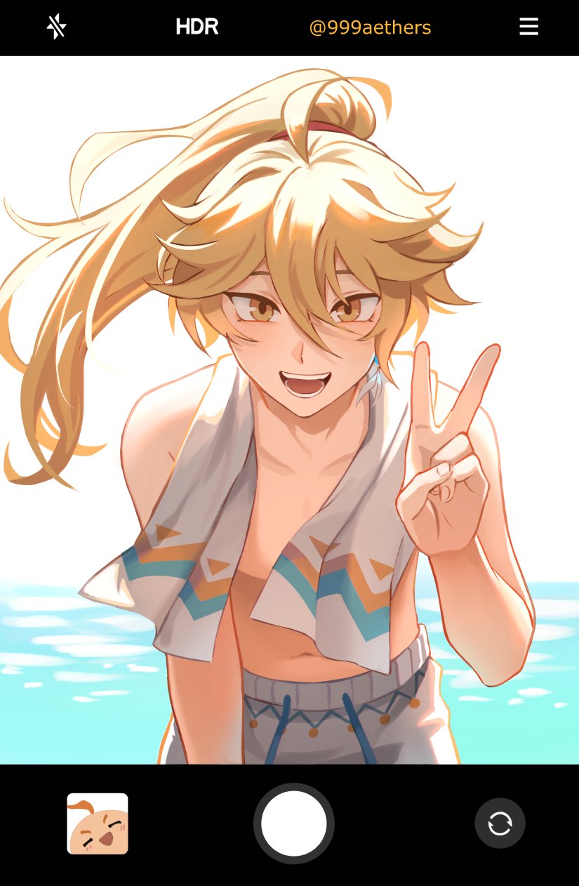 1boy 999aethers aether_(genshin_impact) aether_(hot_springs)_(genshin_impact) blonde_hair fingernails genshin_impact hair_between_eyes highres looking_at_viewer male_focus male_swimwear navel open_mouth ponytail smile swim_trunks teeth topless_male towel towel_around_neck v yellow_eyes