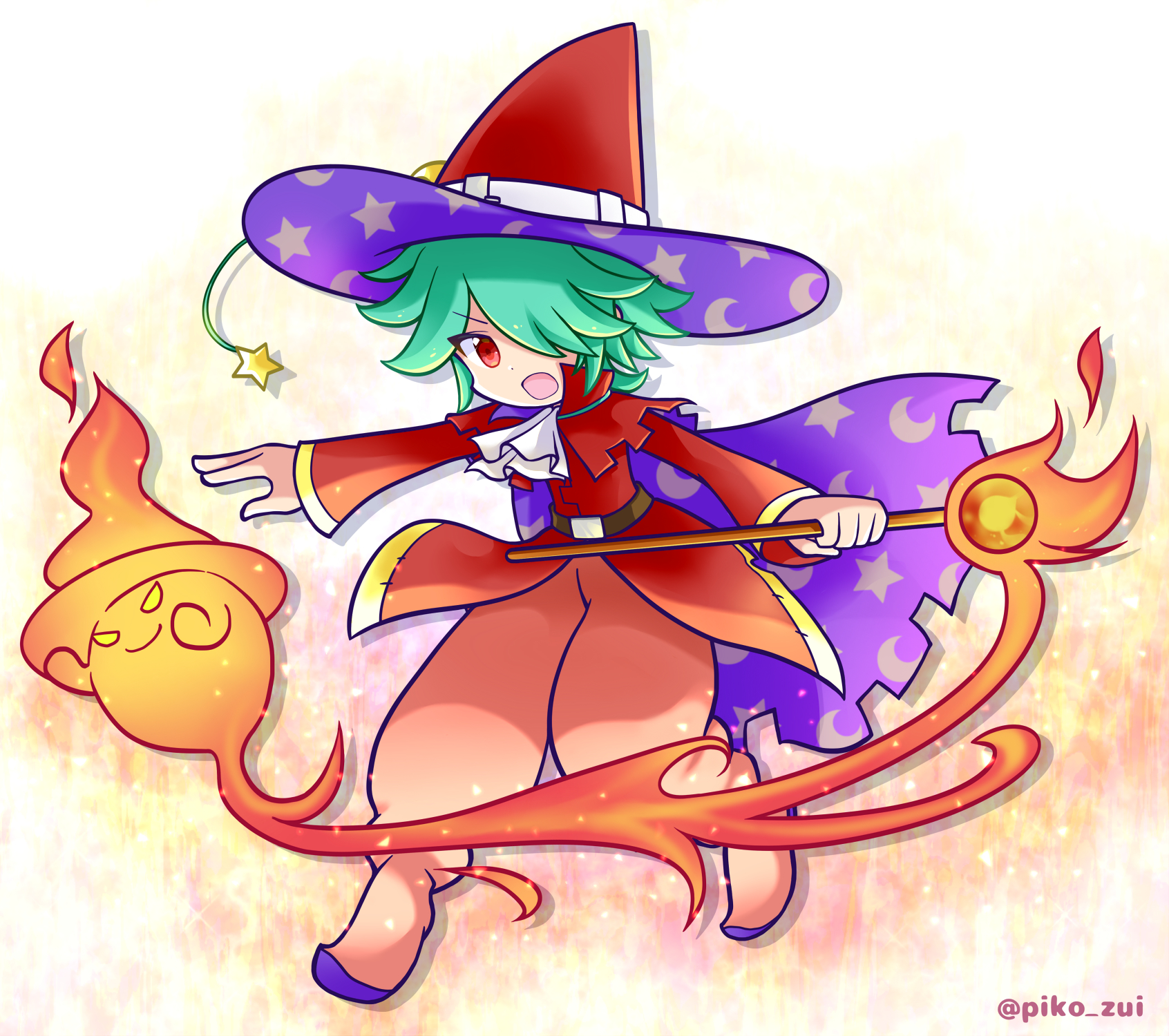 1boy albert_(puyopuyo) artist_name burning capelet coat creature fighting_stance fire flipped_hair full_body gradient_background green_hair hair_over_one_eye hat hat_ornament highres holding holding_staff knee_up male_focus open_mouth orange_background outstretched_arm pants pink_footwear pink_pants purple_capelet purple_hat purple_shoes puyopuyo puyopuyo_quest pyrokinesis radial_gradient_background red_coat red_eyes shoes short_hair solo staff star_(symbol) star_hat_ornament takazaki_piko two-sided_fabric two-sided_headwear underlighting unmoving_pattern v-shaped_eyebrows white_background witch_hat